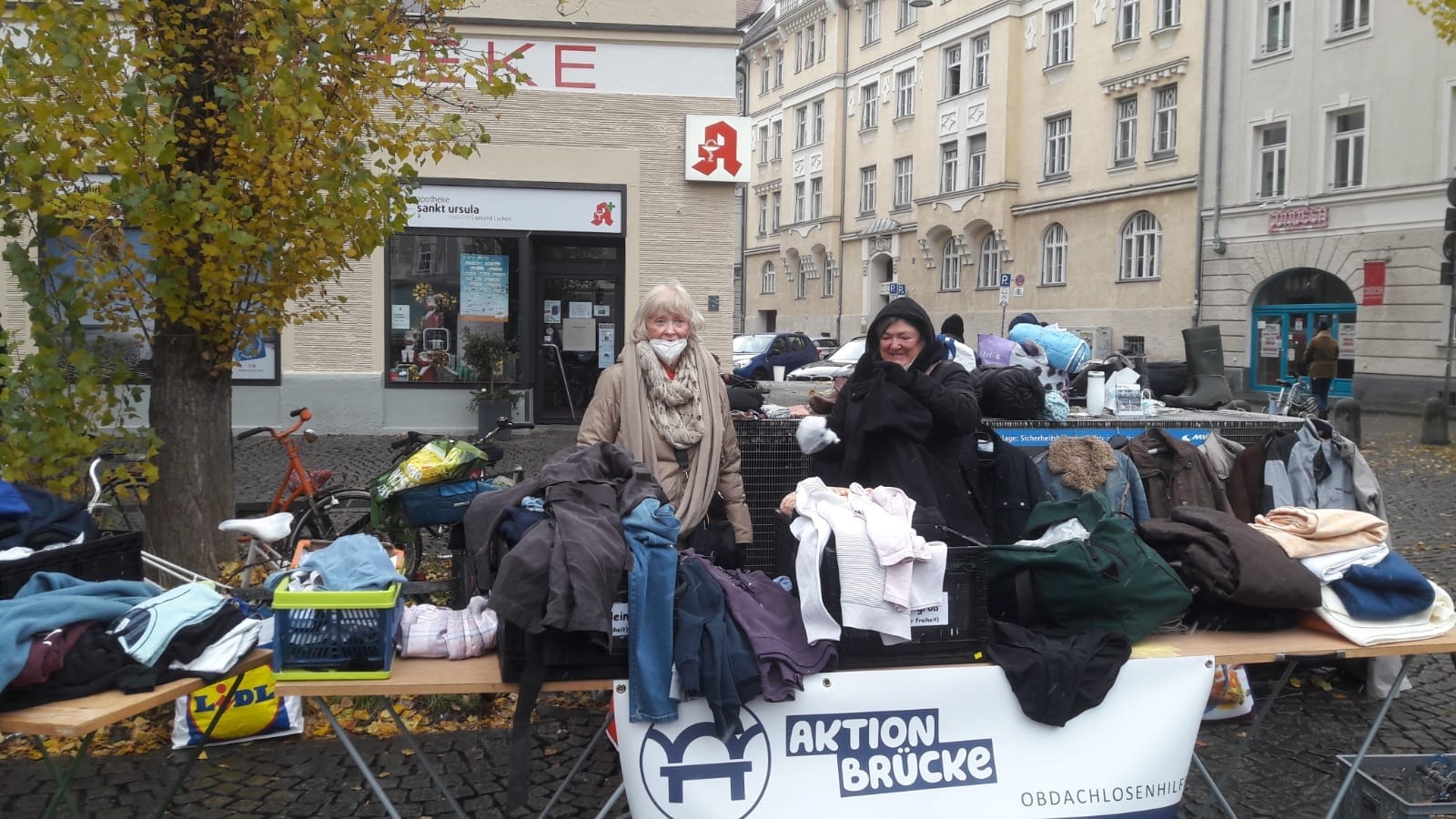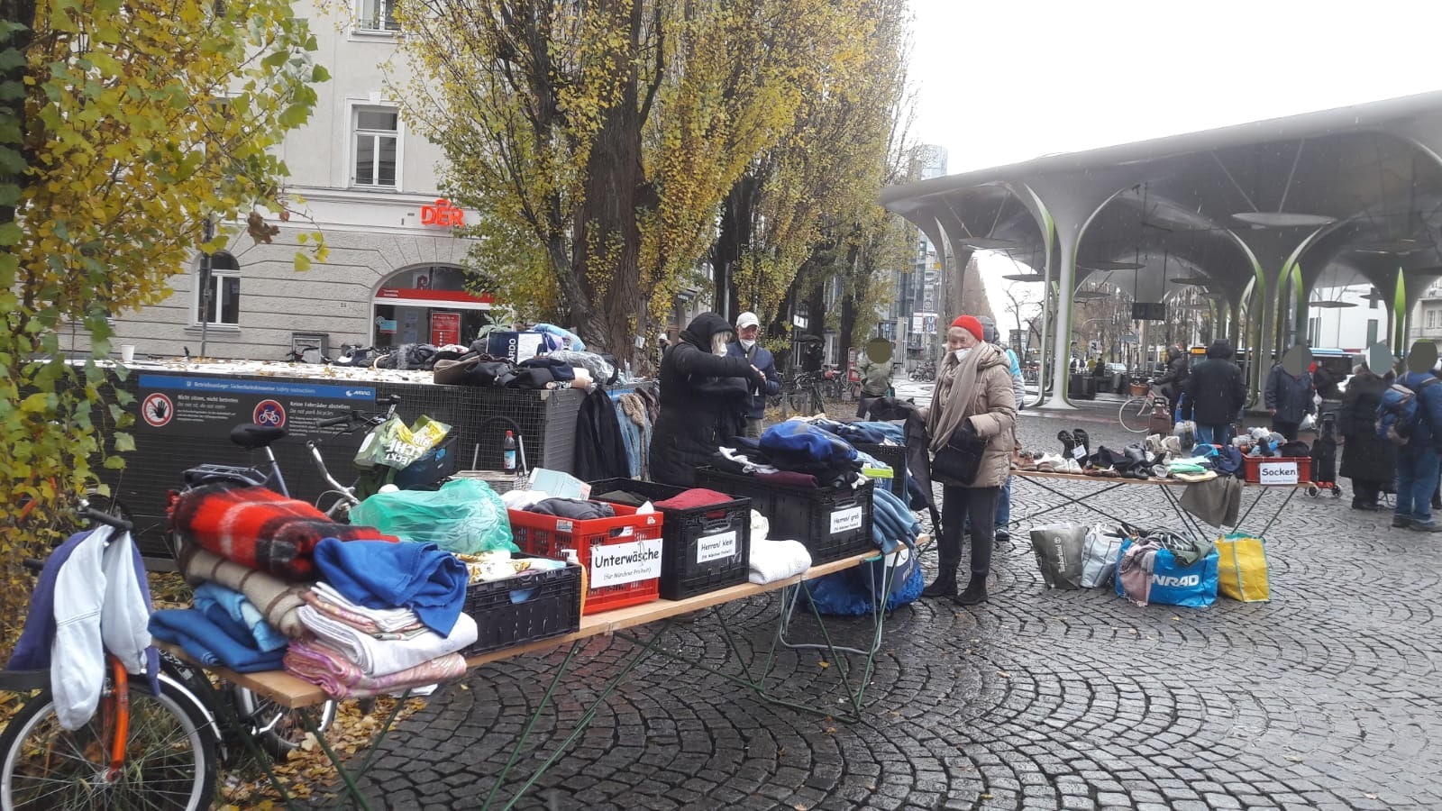 Unser dieswöchiges Münchner Freiheit Team, Ulrike, Rosi, Erich, Christine und Wolfram konnten mit klammen Fingern und nassen Füßen ca. 150 Gäste an unserem Stand mit warmen Kleidungsstücken, Schlafsäcken und weiteren Utensilien ausstatten.