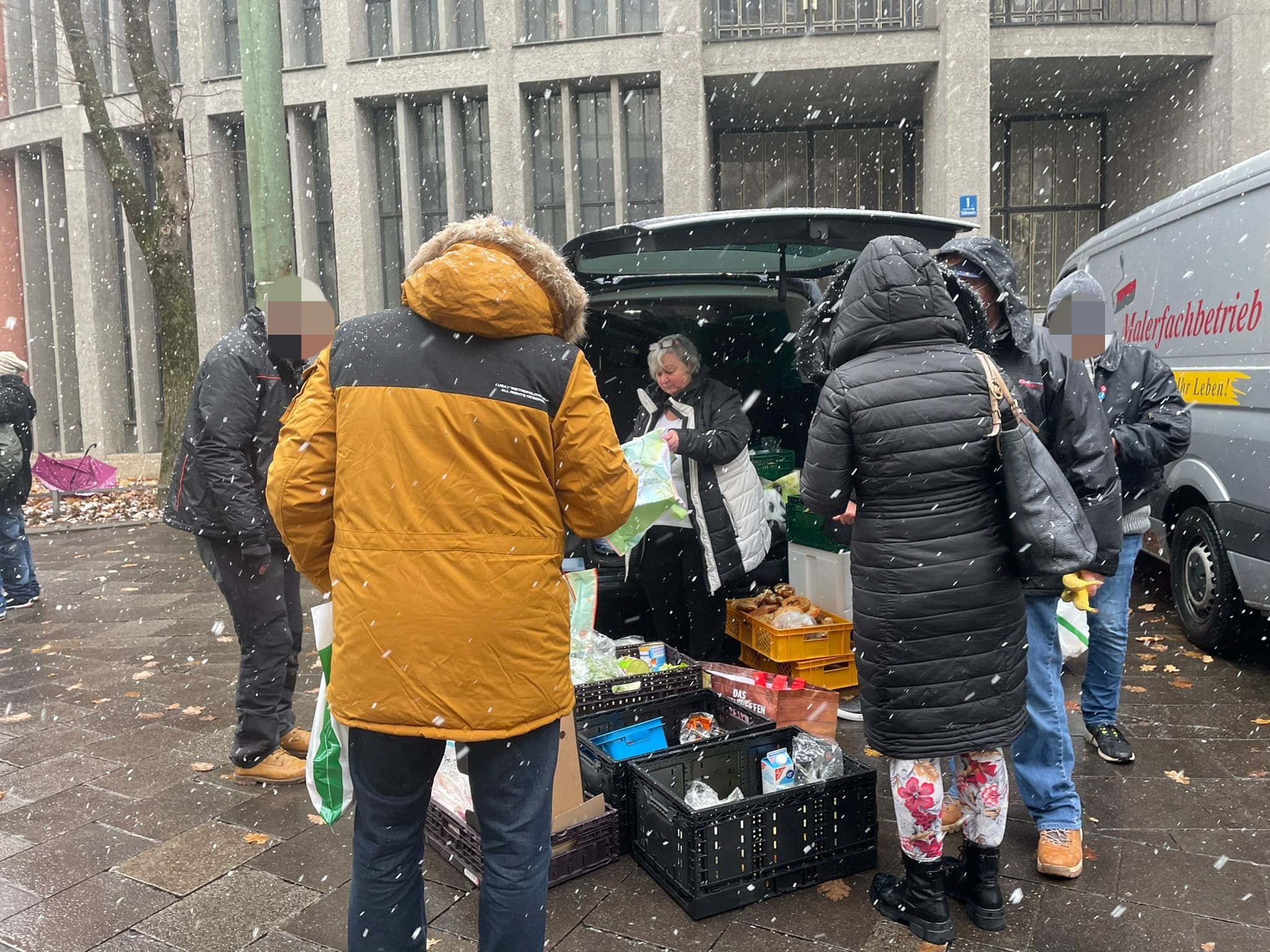 Zu Essen gab es diese Woche einen Eintopf mit Gnocchi und Gemüse sowie einen Schokokuchen von Christel. Heike und auch Vroni kochten Kürbissuppe. Von Johanna gab es Semmelknödel mit Schwammerlsoße und selbstgemachte Lebkuchen. Gaby brachte uns mehrere Blechkuchen, einen Scheiterhaufen und etliche belegte Brote. Von Petra durften wir einen Gemüse-Nudel-Eintopf verteilen und Daniela bereitete Kartoffelsalat und Fleischpflanzerl zu. Ein weiterer großer Topf mit Paprika-Gemüse-Eintopf wurde uns von Charlotte gebracht. Anne kochte eine sämige Kohlsuppe aus Brokkoli und Rosenkohl, backte Bananenmuffins und bereitete eine Weintrauben-Nachspeise zu. Von Sabine konnten wir zum Kaffee einen saftigen Kokos-Ananas-Kuchen mit Marzipan reichen und von Renate gab es nochmal eine riesige Ladung belegte Brote oben drauf. Pünktlich zum ersten Weihnachtswochenende brachte uns Silke eine große Menge selbstgebackenen Christstollen für die Verteilung.