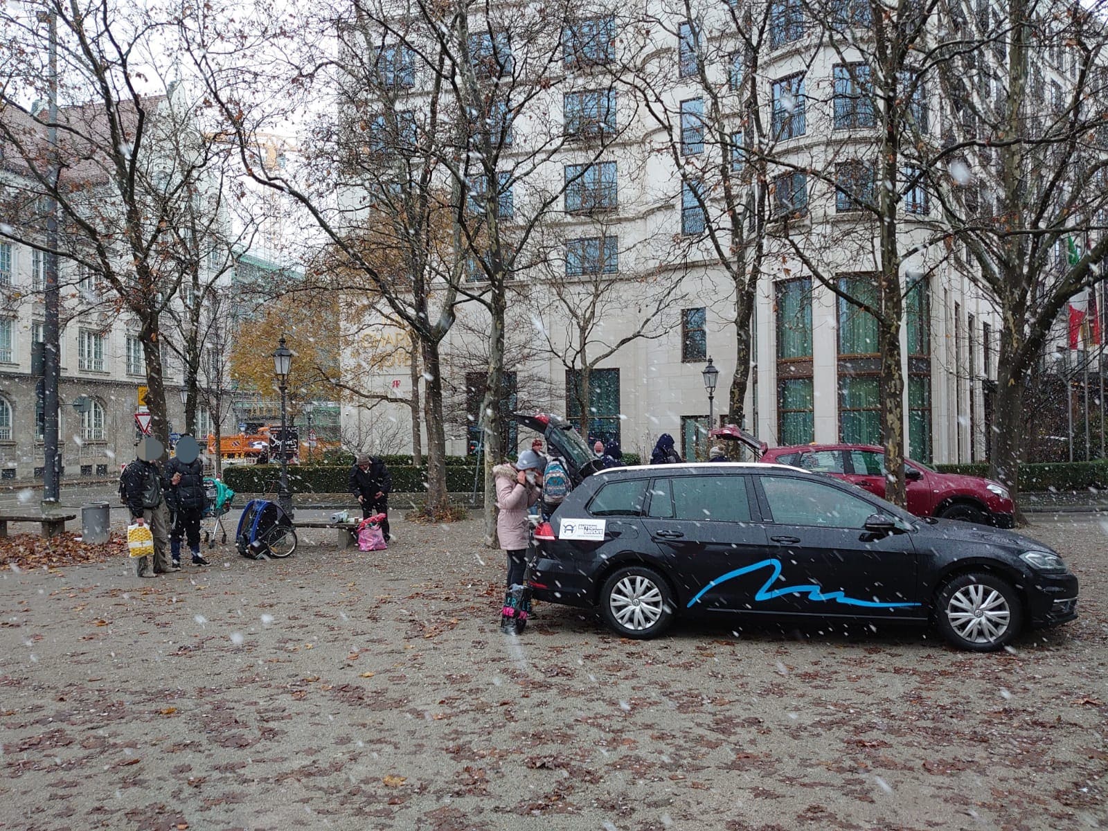 Da es uns dieses Wochenende an einem zweiten großen Auto für Tour 1 mangelte, erklärte sich Peter Hinkofer aus unserem Verpflegungsteam, ohne zu zögern bereit, uns seinen Sprinter zur Verfügung zu stellen. Dieser wurde randvoll mit den frisch eingegangenen warmen Jacken und Schuhen, Schals, Pullovern, Handschuhen und Mützen bestückt.