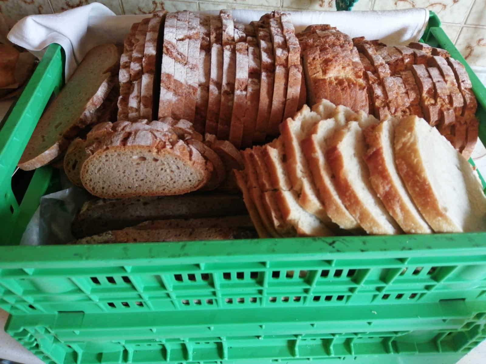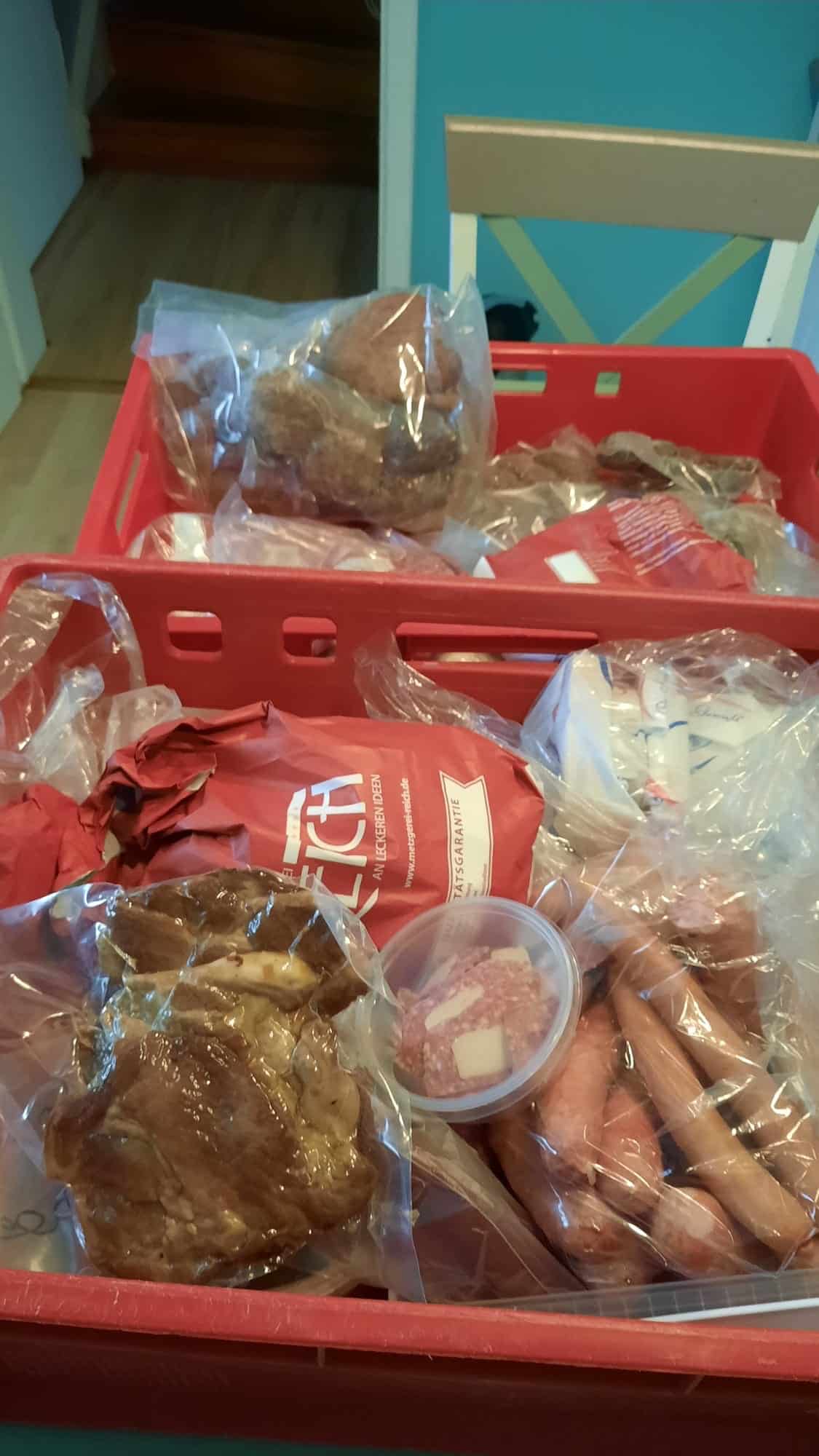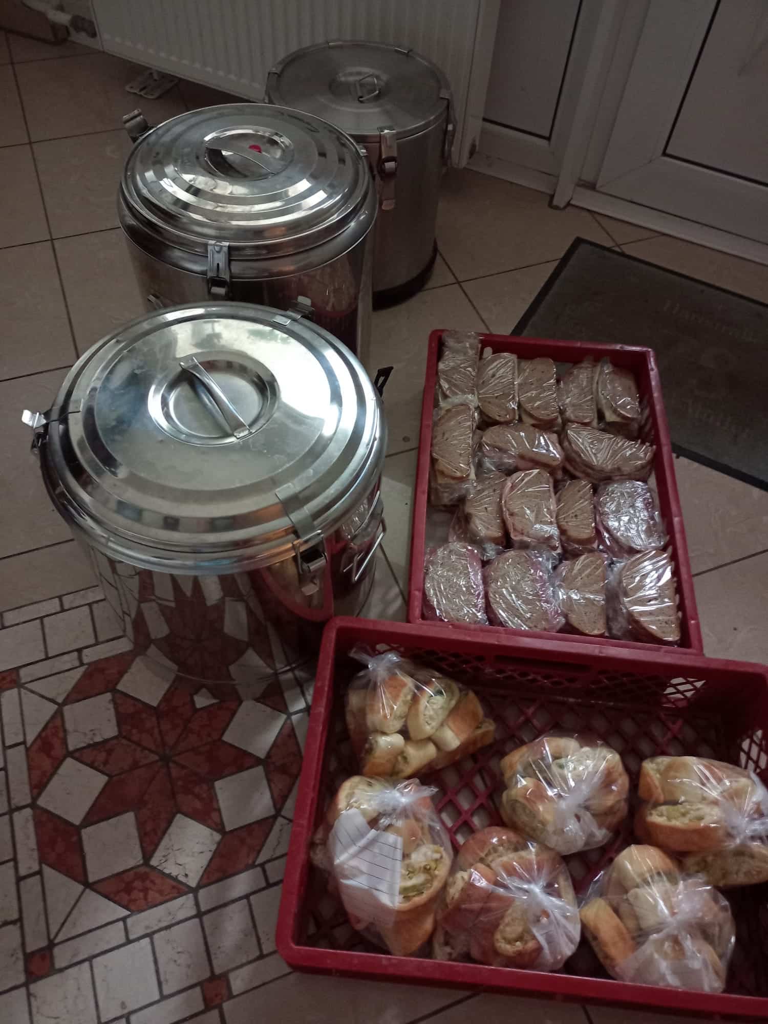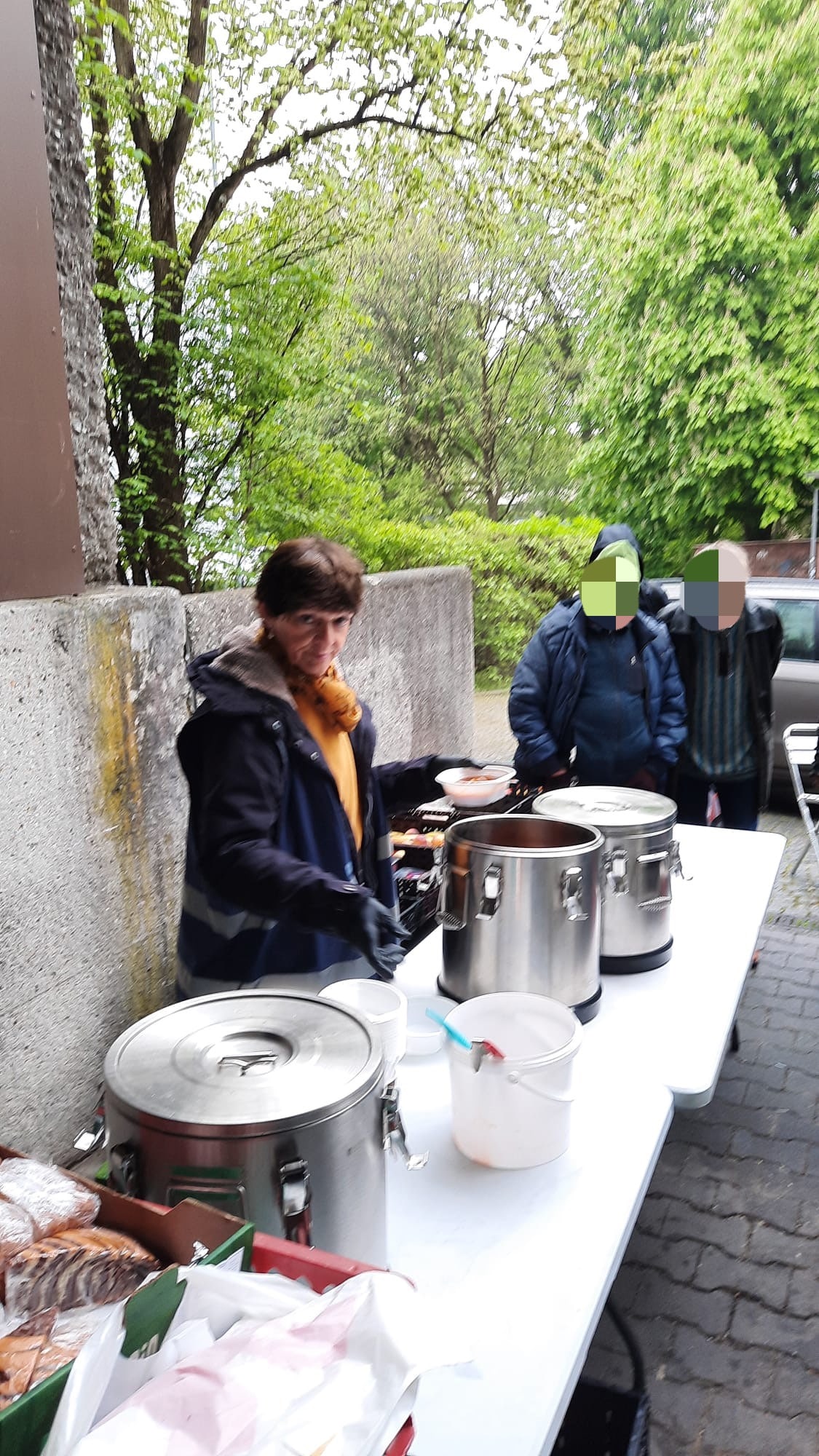 Zu Essen gab es gestern 50 Liter Nudel-Gemüse-Pfanne mit Würstl, 30 Liter Gemüse-Eintopf mit Fleisch sowie 50 belegte Brote und eine große Menge Lauch-Blätterteig-Schnecken von Johanna. Gaby Sch. kochte 30 Liter Würstlgulasch, backte Apfel- und Rhabarberkuchen mit Rahm und steuerte 30 Käsebrote bei. Von Renate kamen 70 weitere belegte Brote hinzu. Gaby G. kochte 20 Liter Gulaschsuppe und 10 Kilo Nudeln. Von Maria wurden 7 Kilo Hackbraten mit Soße und 20 Liter Kartoffelpüree zubereitet. Anne kochte Eintopf, kistenweise Eier hart und bereitete viele Portionen Nachspeise zu, welche wir gut gekühlt verteilen konnten. Auch von Silke durften wir vier Bleche Kuchen entgegen nehmen.