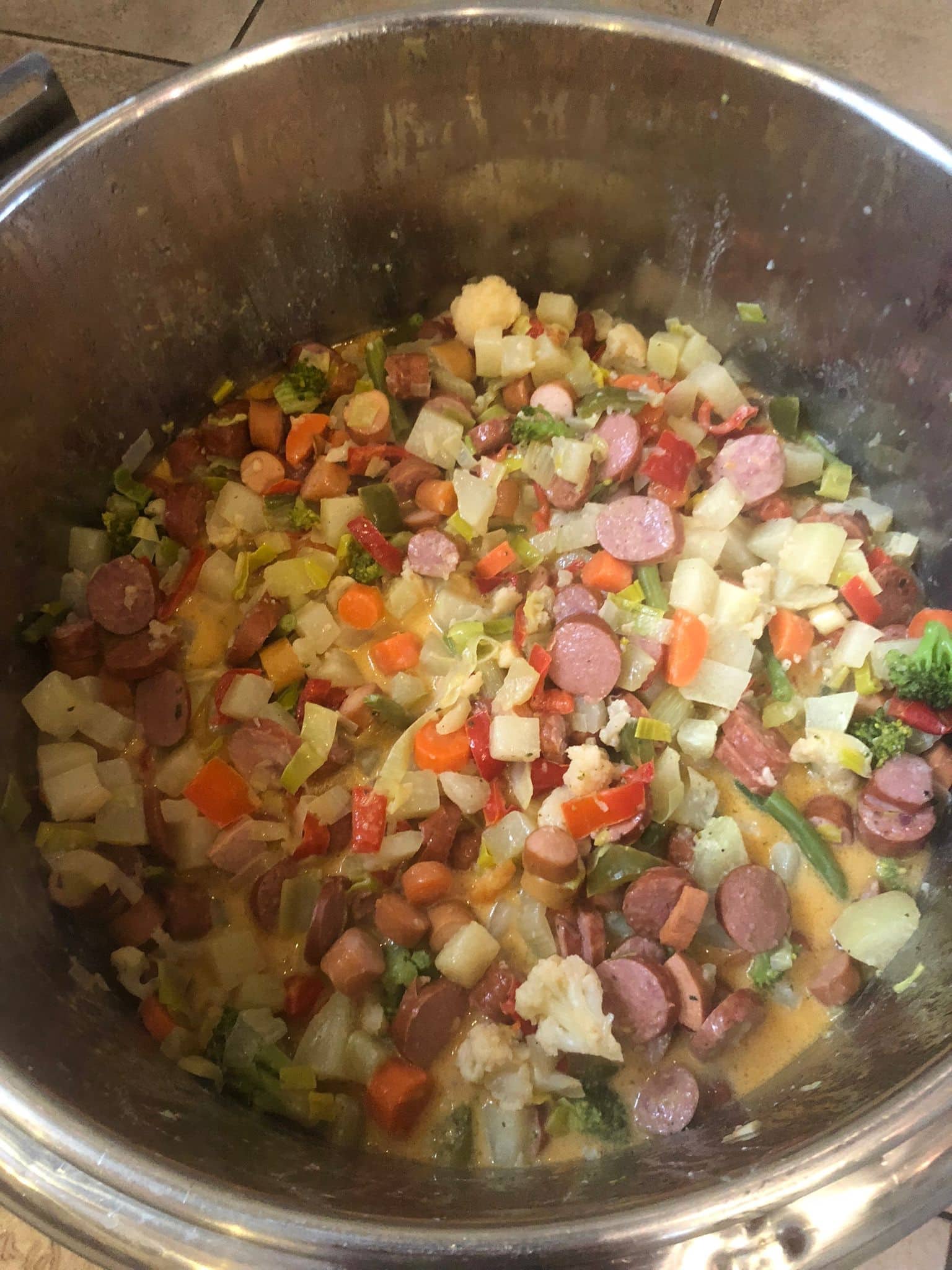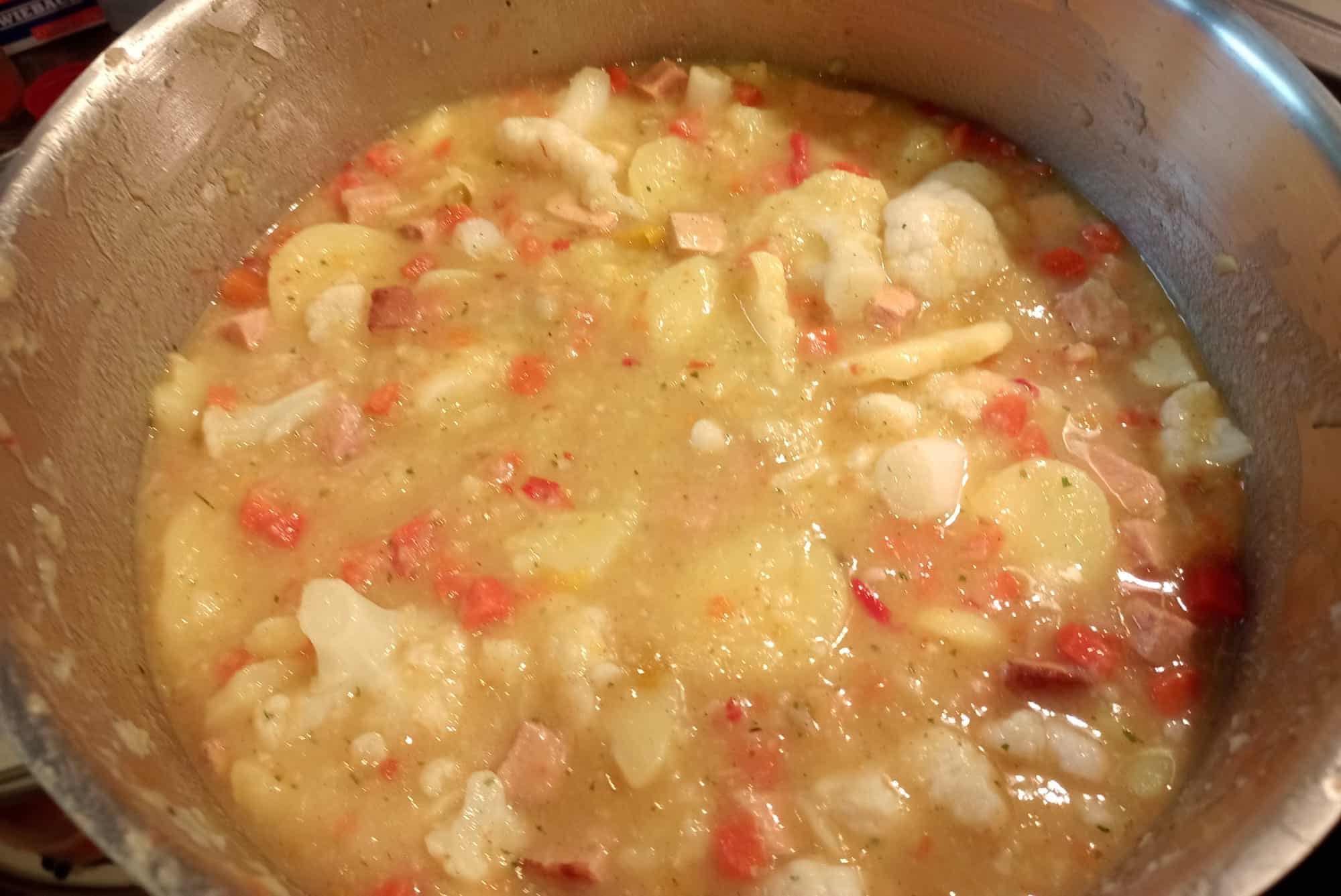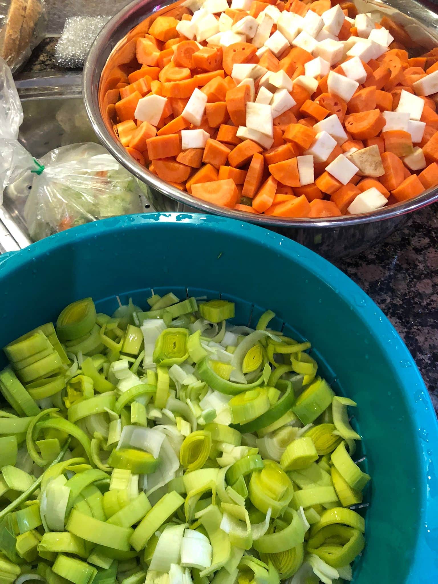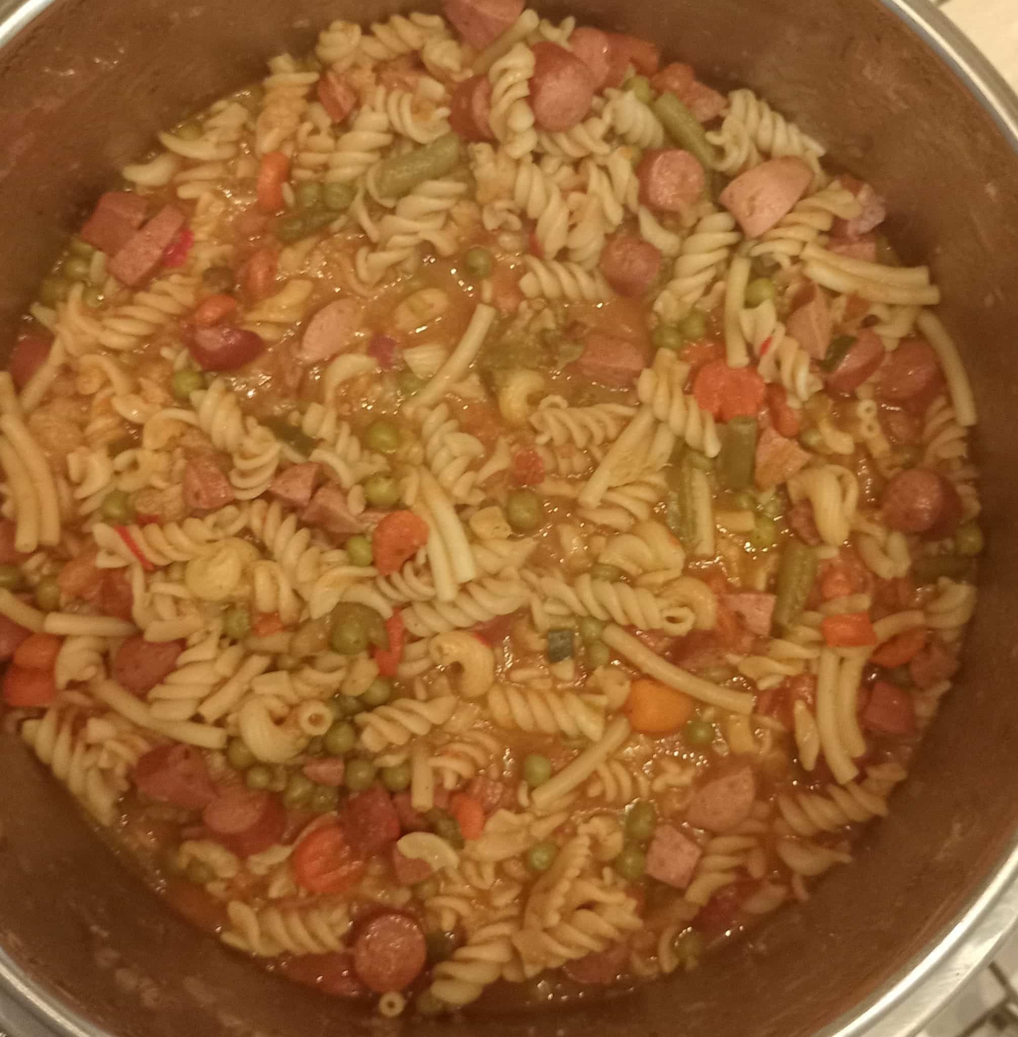 Zu Essen gab es gestern 50 Liter Nudel-Gemüse-Pfanne mit Würstl, 30 Liter Gemüse-Eintopf mit Fleisch sowie 50 belegte Brote und eine große Menge Lauch-Blätterteig-Schnecken von Johanna. Gaby Sch. kochte 30 Liter Würstlgulasch, backte Apfel- und Rhabarberkuchen mit Rahm und steuerte 30 Käsebrote bei. Von Renate kamen 70 weitere belegte Brote hinzu. Gaby G. kochte 20 Liter Gulaschsuppe und 10 Kilo Nudeln. Von Maria wurden 7 Kilo Hackbraten mit Soße und 20 Liter Kartoffelpüree zubereitet. Anne kochte Eintopf, kistenweise Eier hart und bereitete viele Portionen Nachspeise zu, welche wir gut gekühlt verteilen konnten. Auch von Silke durften wir vier Bleche Kuchen entgegen nehmen.