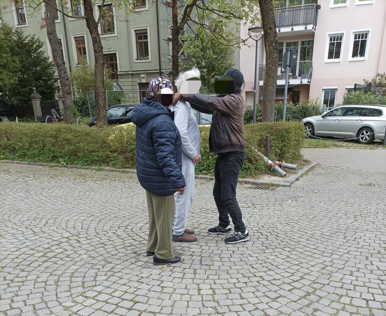 An einer weiteren Station kam eine Frau auf uns zu. Sie hatte einen alten Herrn untergehakt und bat uns um Unterstützung, da der Herr sich verlaufen hatte und nicht mehr heimfinden würde. Er war mit einem etwas sehr dünnen Hausanzug und nur mit Hausschuhen bekleidet.