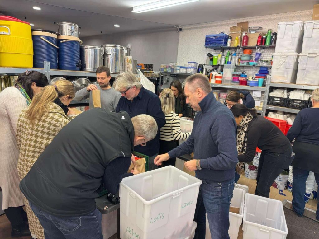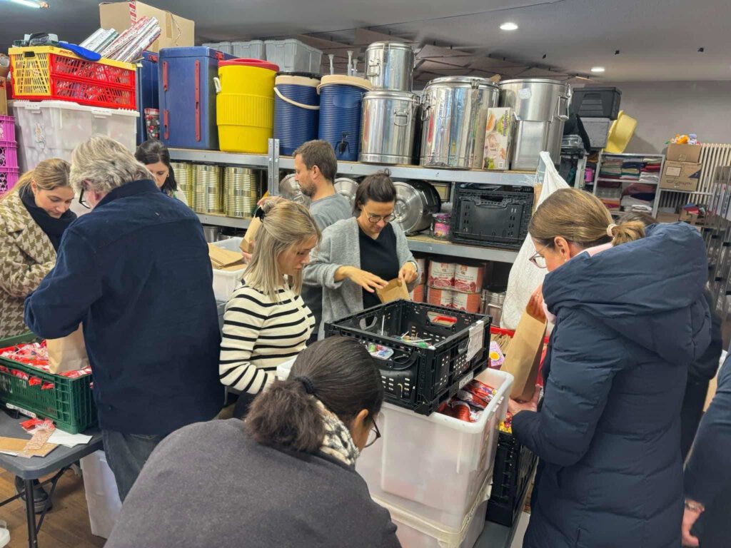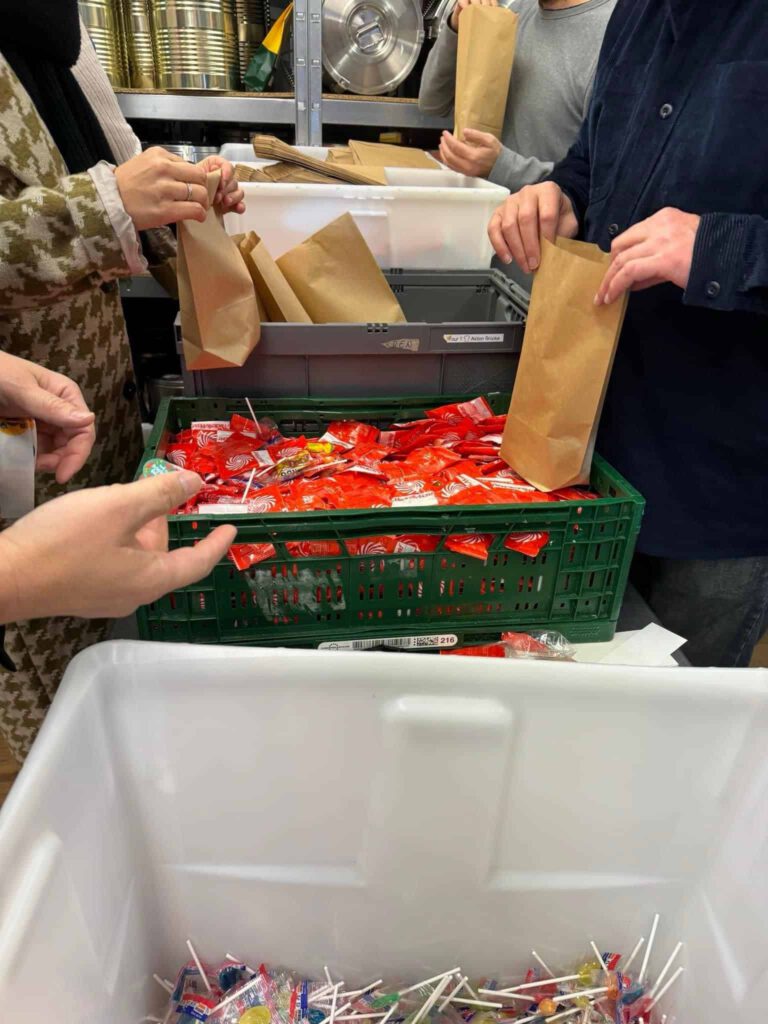 Gemeinsam packten Anja und Vroni mit den 11 MitarbeiterInnen insgesamt 600 Nikolaussackerl für unsere Gäste. Bestückt wurden die Sackerl mit den gespendeten Schokoladennikoläusen, Pralinen, Gummibärchen und einer Packung Tee.