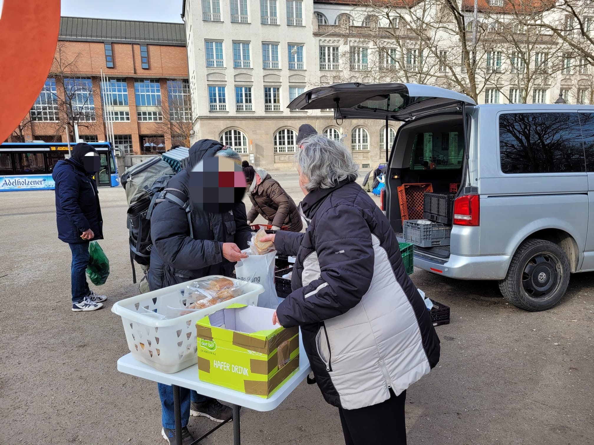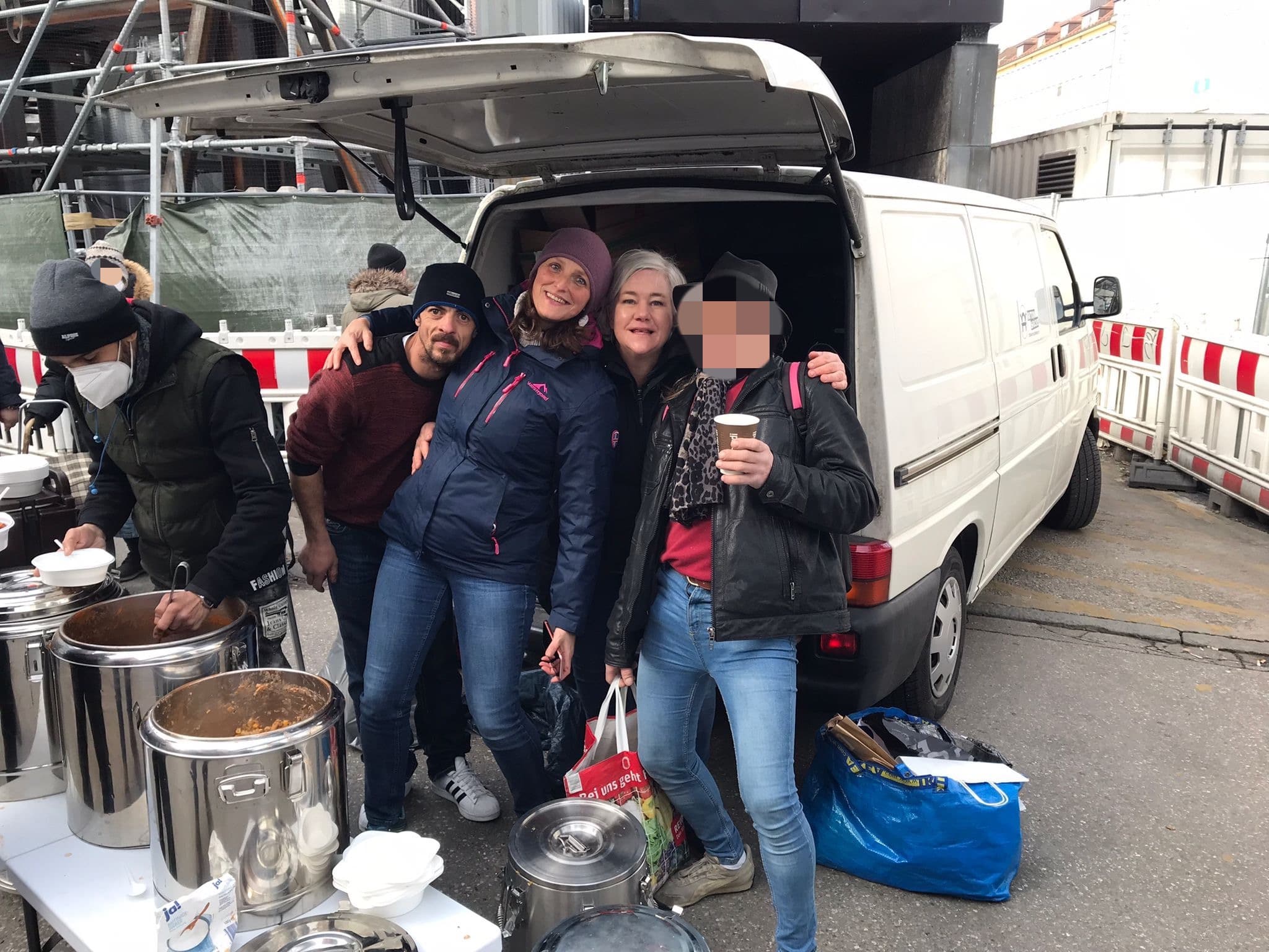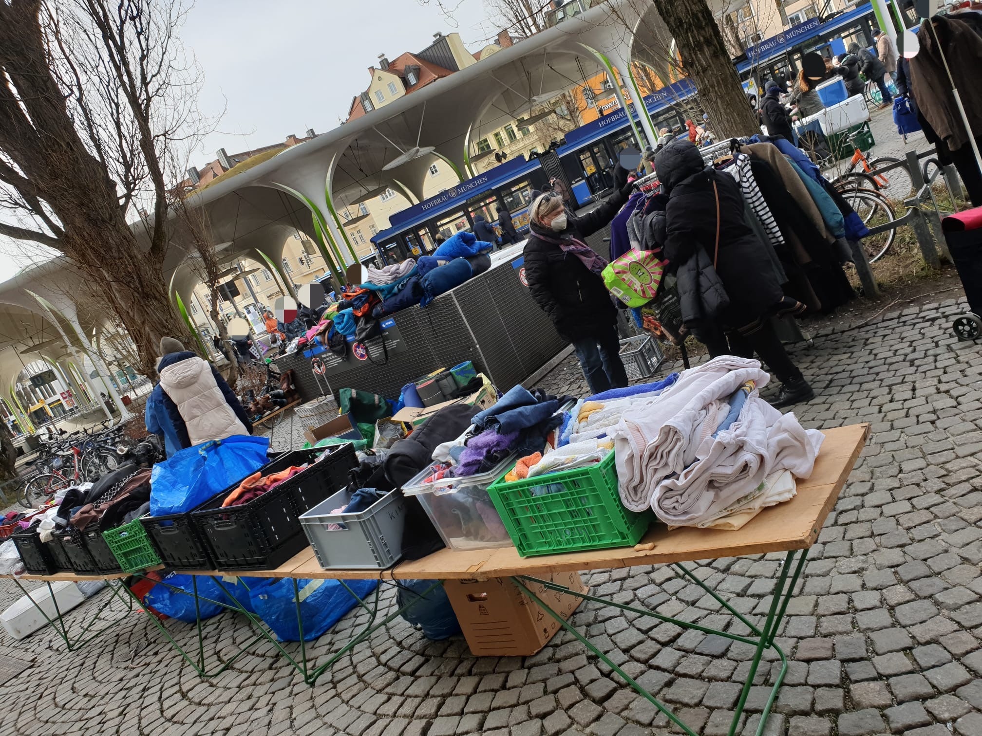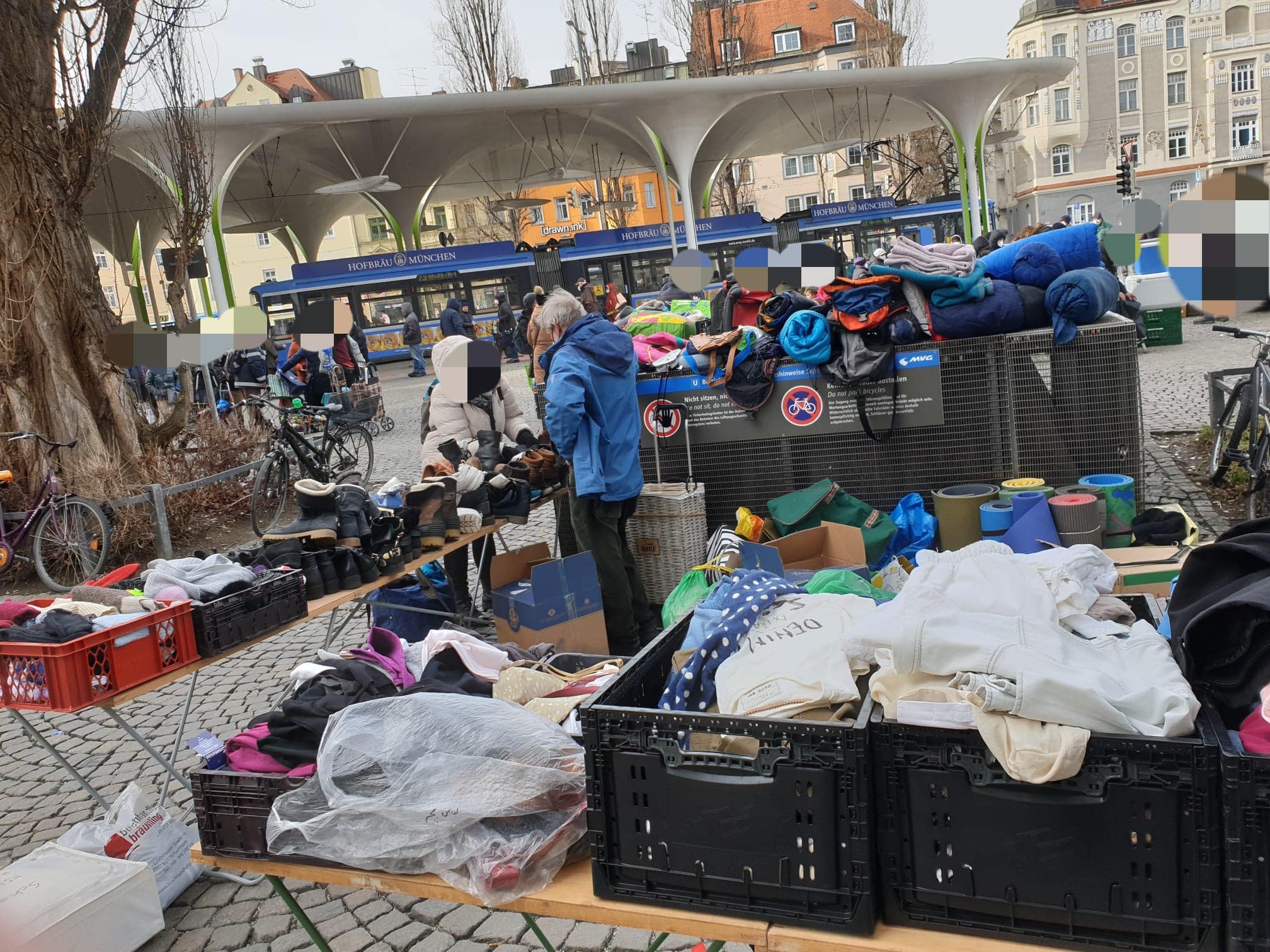 Auch unser Team am Stand der Münchner Freiheit trotze dem eisigen Wind und verteilte stundenlang dicke, warme Jacken, Hosen, Handschuhe und Mützen, Isomatten und Schlafsäcke. Gemeinsam zählten Petra, Rosi und Dieter, Wolfram und Christine ca. 200 Bedürftige, die trotz des Sturms geduldig in Reih und Glied warteten bis sie dran kamen.