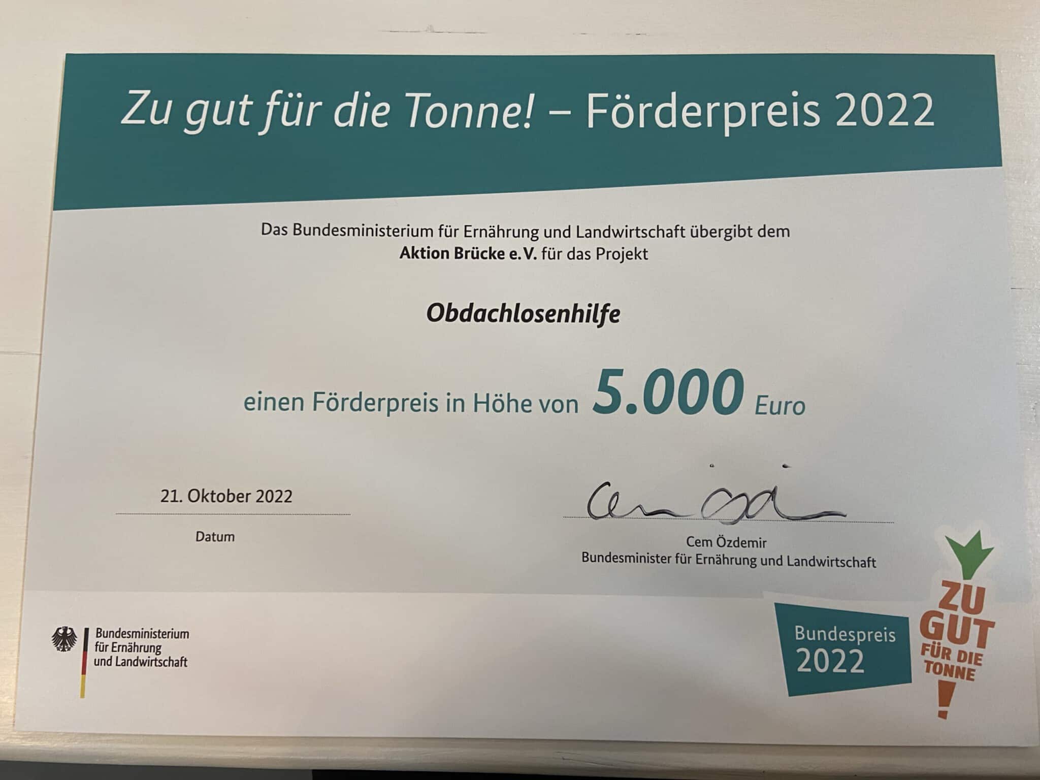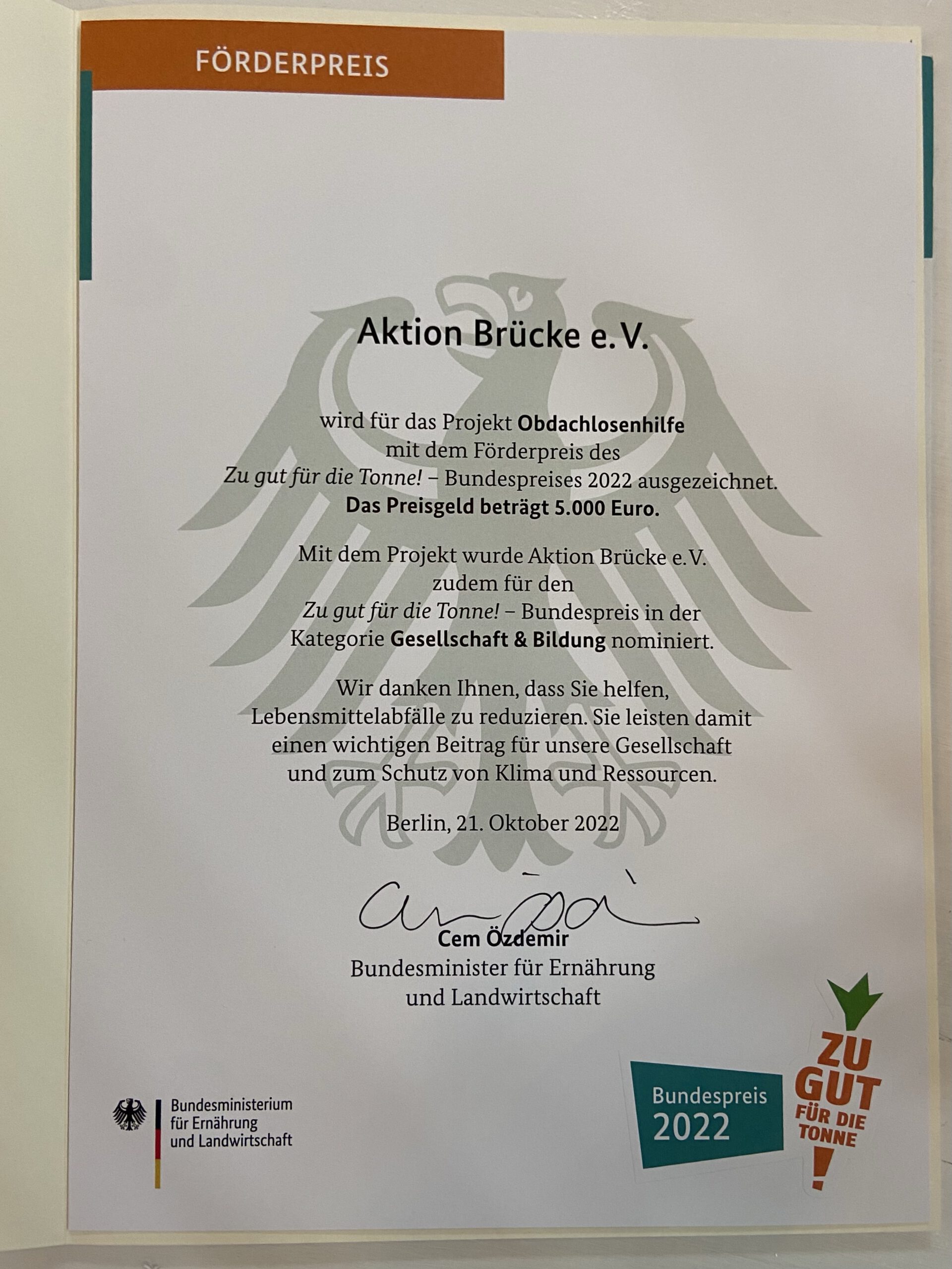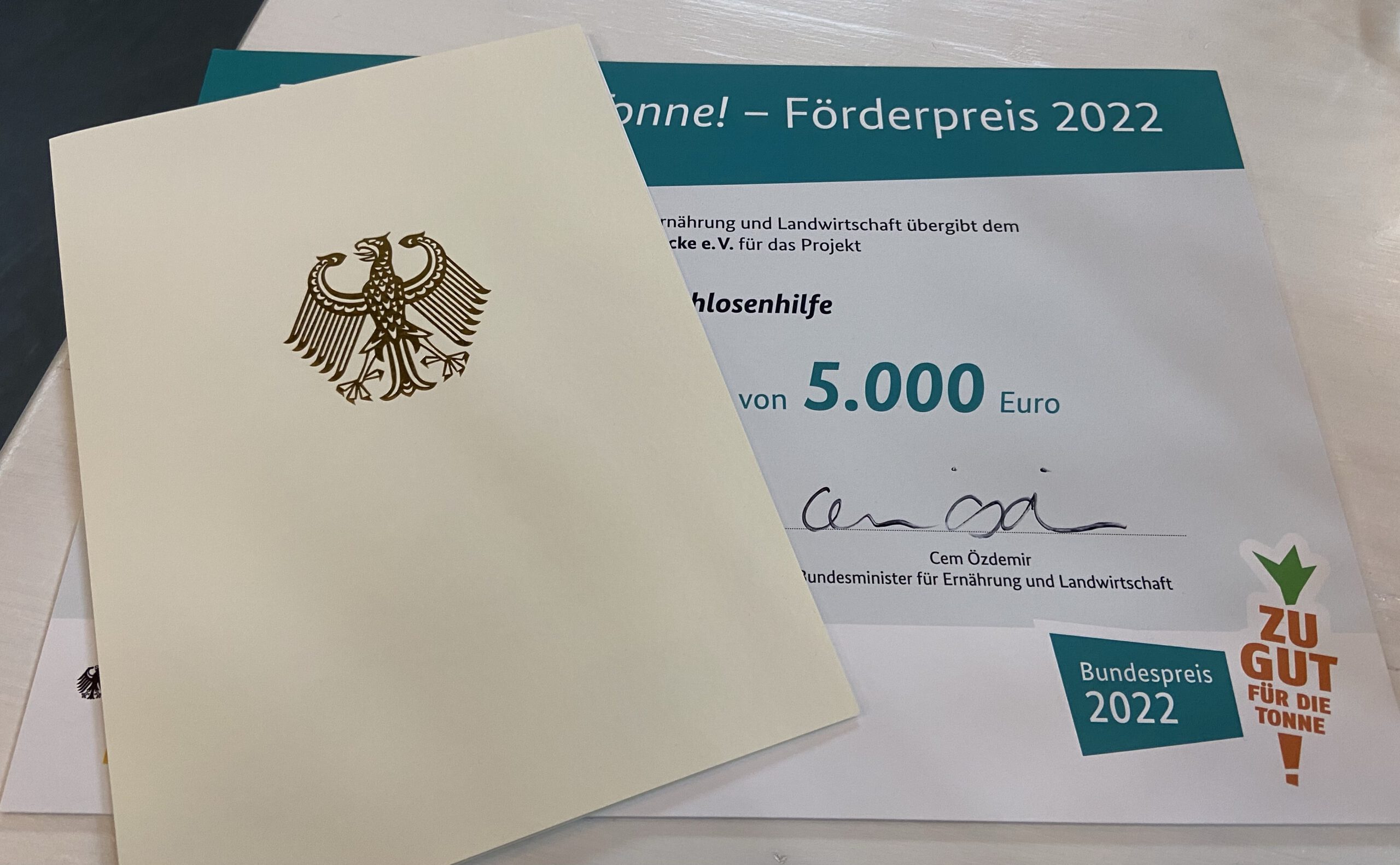 Wir freuen uns riesig und sind stolz Ihnen heute verkünden zu dürfen, dass wir den „Zu gut für die Tonne!“ Förderpreis, des Bundesministeriums für Ernährung und Landwirtschaft, im Wert von 5.000€ gewonnen haben.