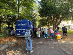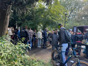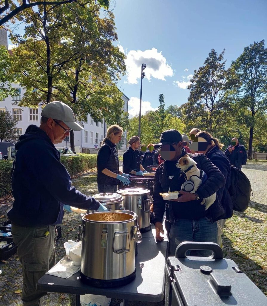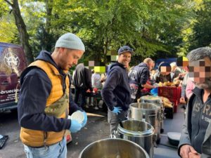 Auch gestern verteilten wir neben Lebensmitteln und warmen Speisen wieder Unmengen warme und gut gefütterte Kleidung, Schlafsäcke und Isomatten. Und dennoch müssen wir oftmals schweren Herzens den Ein oder Anderen um eine Woche vertrösten, weil wir diese dringend benötigen Hilfsgüter nicht in ausreichender Anzahl vorrätig haben.