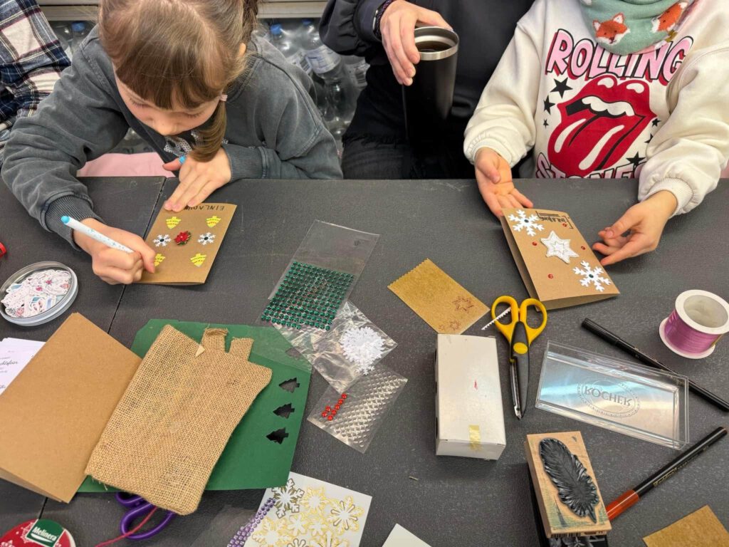 Gerade die Kinder waren ganz begeisterte Bastelpaten. Eifrig wurde geschnitten, gefalzt, gemalt, geklebt und mit Glitzer verziert.