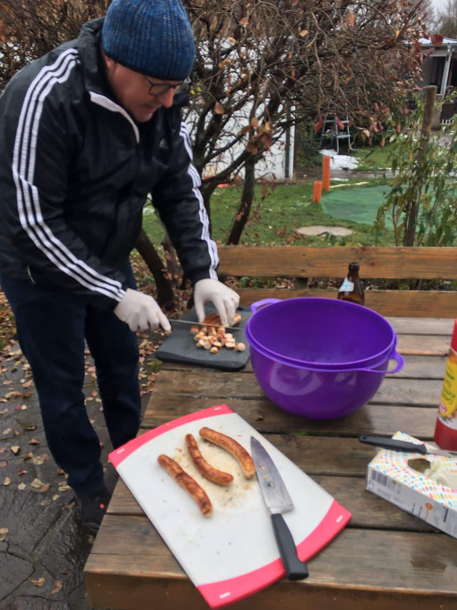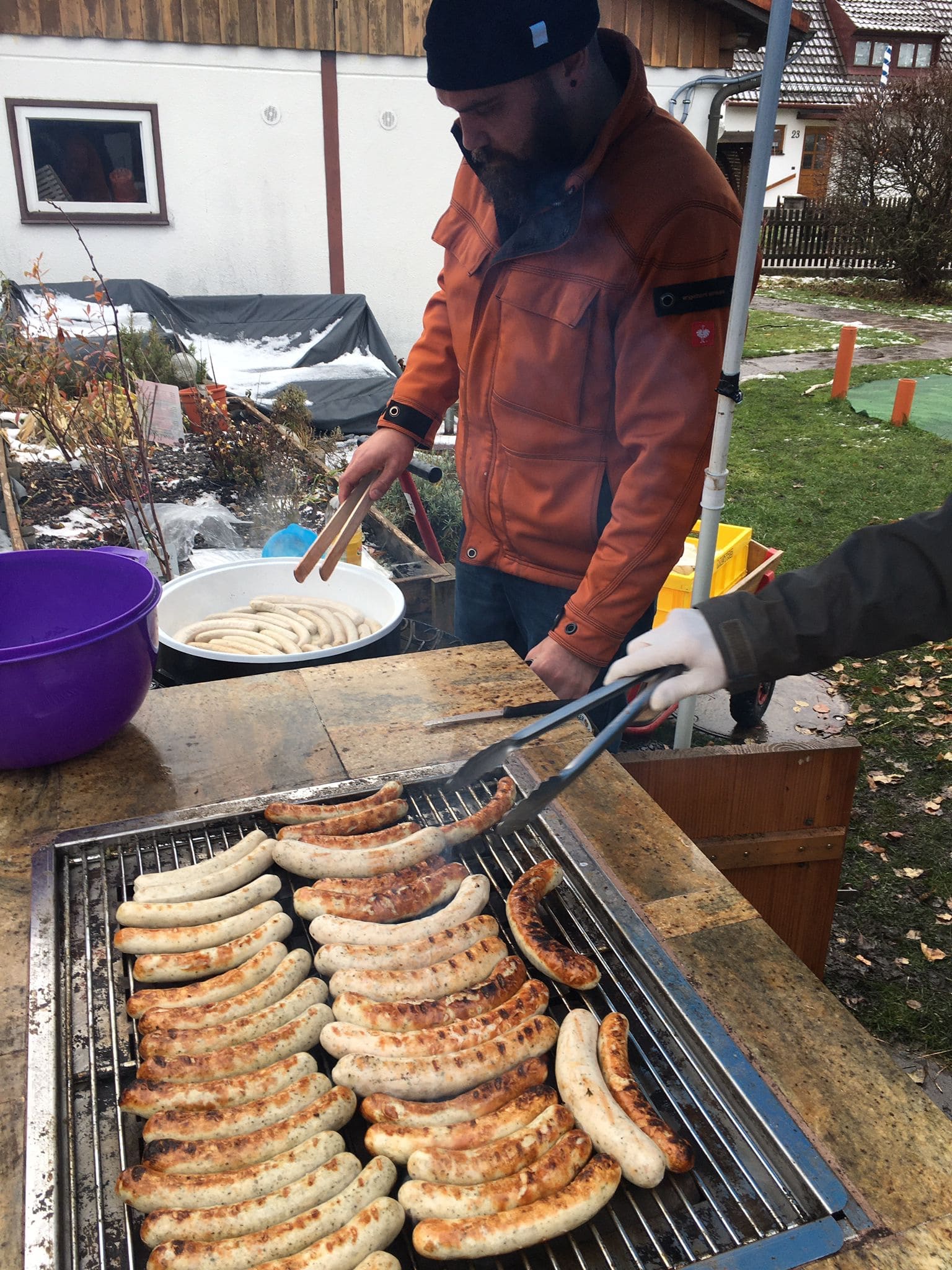 Vielen Dank an Andrea und ihre Nachbarn, an Gaby Sch. und Johanna für die Verarbeitung und Zubereitung. Die Würstel wurden trotz Schnee und Kälte draußen gegrillt, geschnitten und in leckerer Currysoße verkocht.