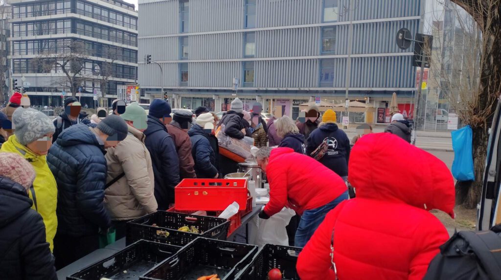 Eine 88 jährige Rentnerin, die wir schon bald 2 Jahre kennen, besucht uns jeden Sonntag auf unserer Tour. Ihre Rente ist zu gering um sich noch große Sprünge zu erlauben. „Wie sagt man so schön? Zum Sterben zu viel, zum Leben zu wenig“ lächelt sie anspruchslos. „Manchmal muss man sich zwischen dem Einkauf von Lebensmitteln und der Bezahlung einer schon lange überfälligen Rechnung entscheiden“.