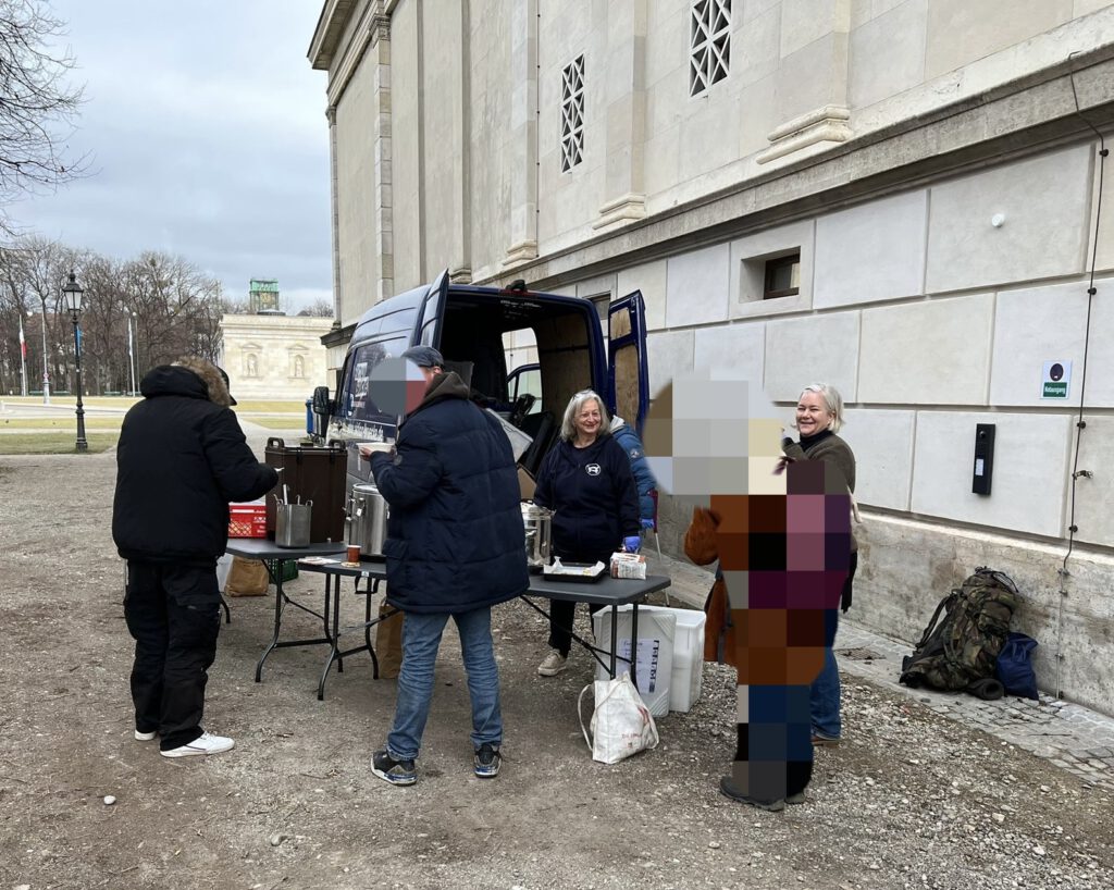 Bereits hier wurden etliche Teller warme Mahlzeiten verteilt und eine Lebensmitteltasche nach der anderen gepackt.