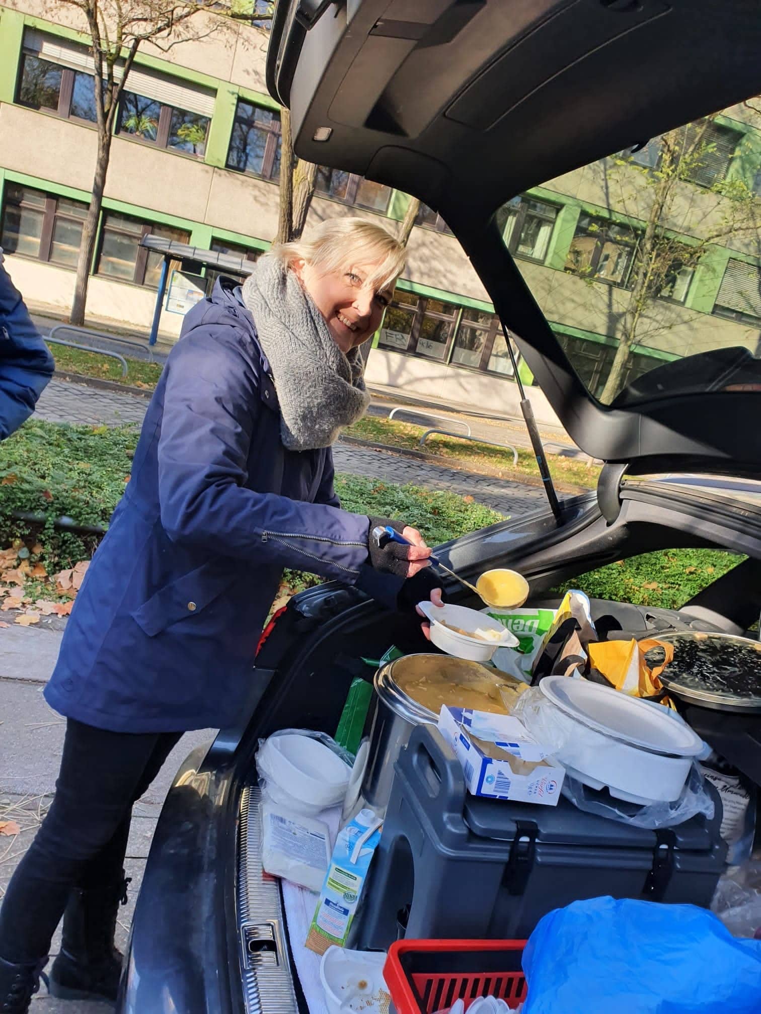 Vroni und Jorge, Jule, Anja und Ahmed gaben warme Mahlzeiten in Akkordarbeit an die, in der Kälte wartenden, Menschen aus.