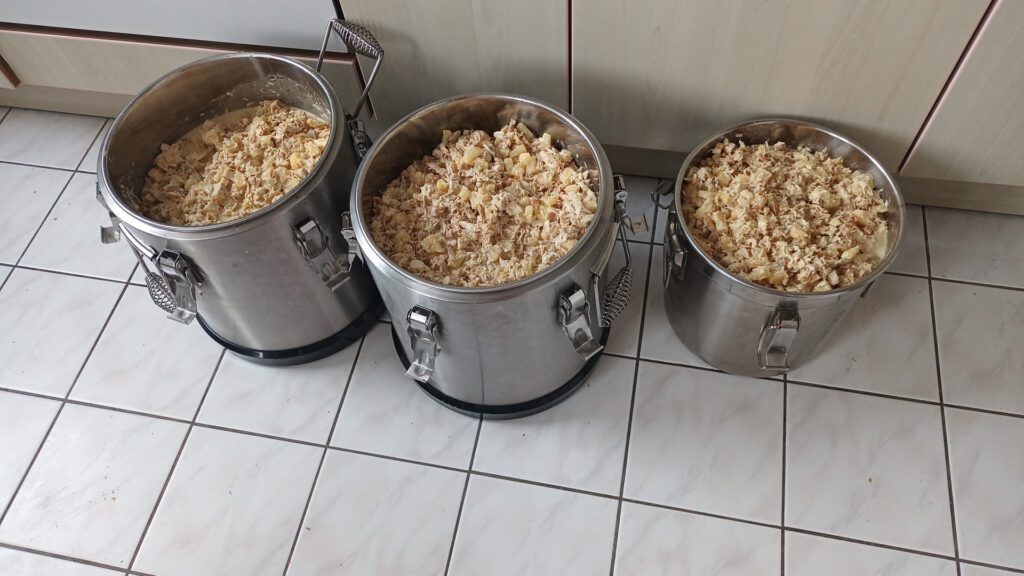 Vor etwa zwei Wochen, bekamen wir von einer Veranstaltung der Gemeinde Emmering 200 Stück übriggebliebene, fertig gegrillte, halbe Hendl gespendet. Solche Lebensmittelspenden sind für uns ein Segen. Zum Einen, weil wir es großartig finden, dass nichts weggeworfen werden muss und Menschen davon noch satt werden können und zum Anderen, weil wir solche Produkte ohne großen Aufwand zu köstlichen Mahlzeiten weiterverarbeiten können. Somit wurden die Hendl von uns entbeint und das gezupfte Fleisch in unserem Tiefkühler gelagert  bis wir daraus einen leckeres Hühnerfrikassee und einen exotischen Hendlsalat mit Annas zubereiten konnten.