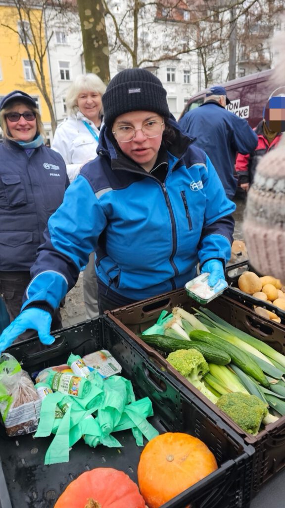 Ein ganz besonderes Highlight entstand spontan an der dritten Station. Als unser Frank für eine kleine Comedy-Einlage zum „Münchner Marktschreier“ mutierte, war das Eis sofort gebrochen. Einige kannten diese Rolle bereits und fingen direkt an zu lachen. So gab es nicht nur reichlich Lebensmittel für die Straße und für zu Hause, sondern auch beste Unterhaltung. Es wurde geschmunzelt, gerufen, gescherzt und die Stimmung stieg trotz winterlicher Temperaturen spürbar an. Humor verbindet und macht vieles leichter.