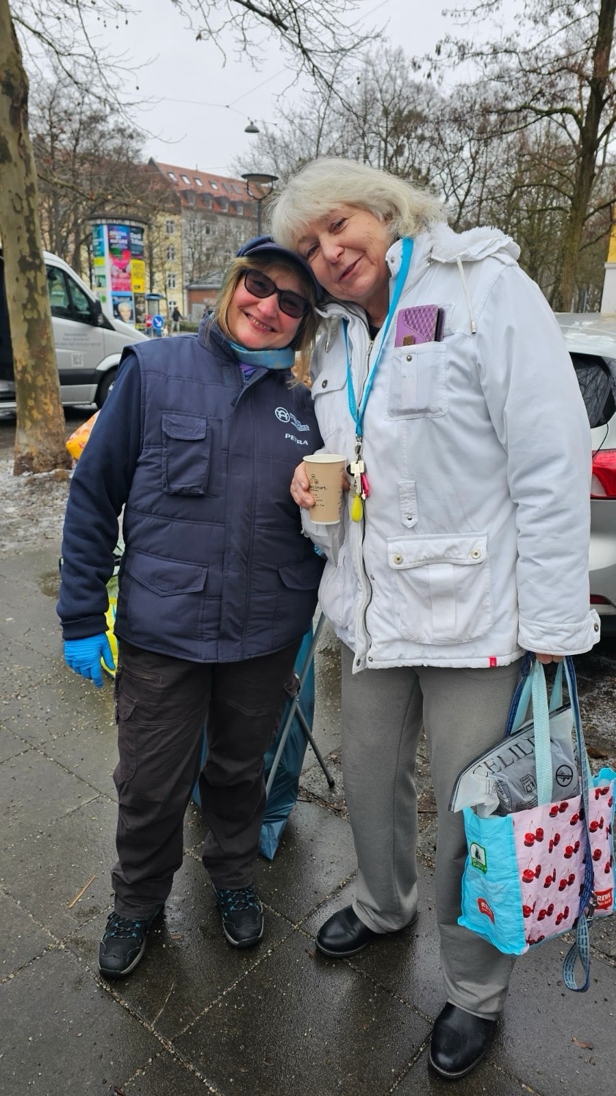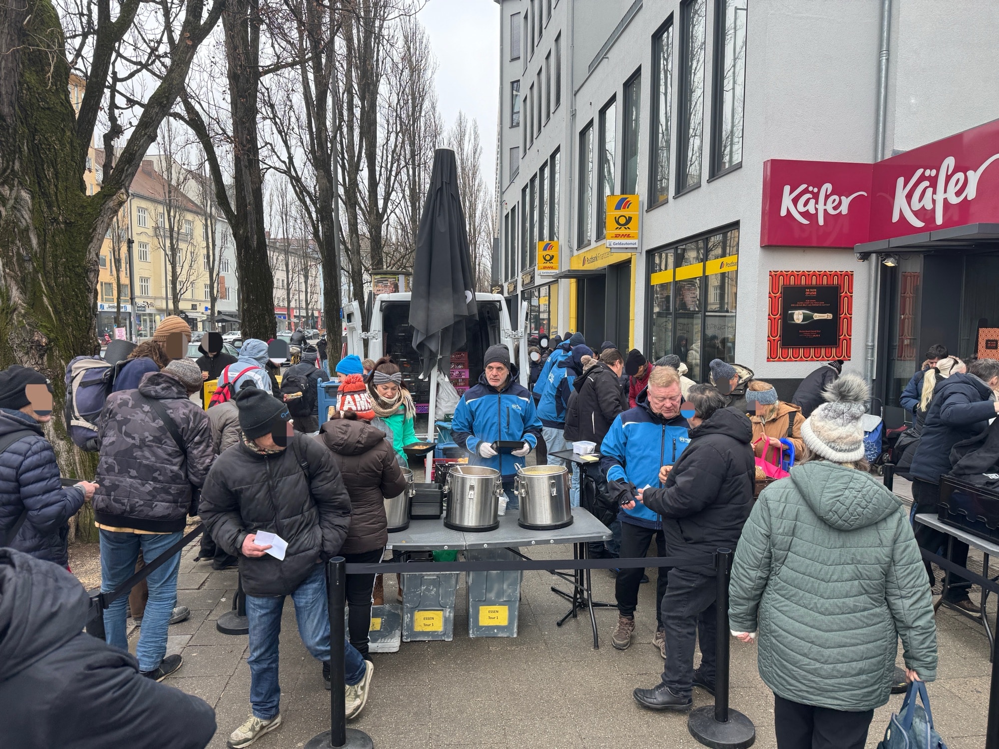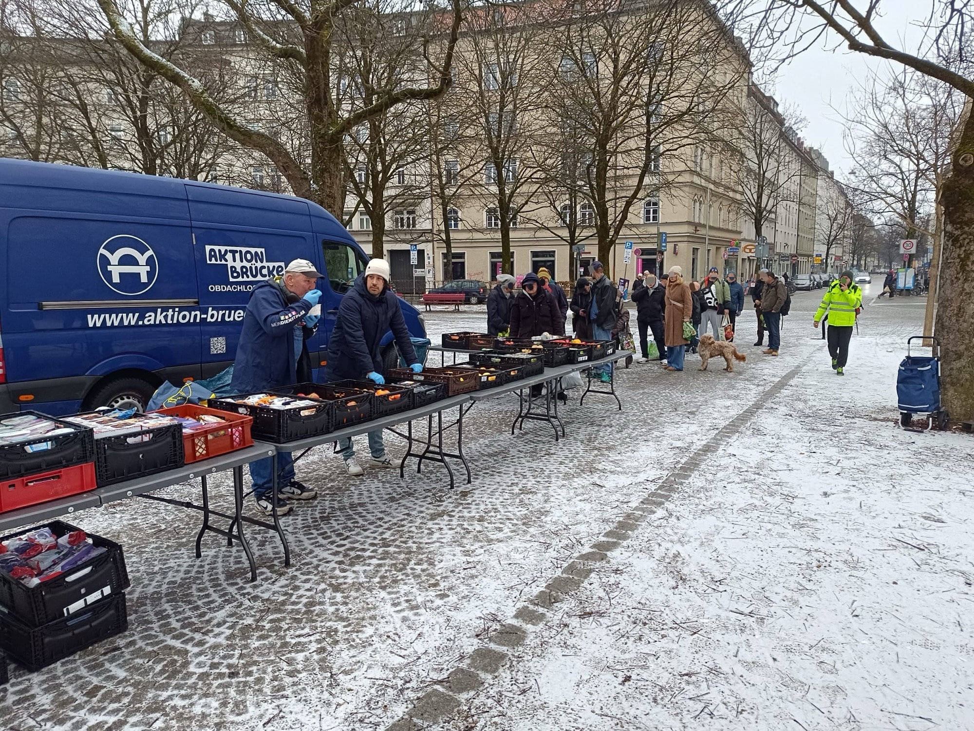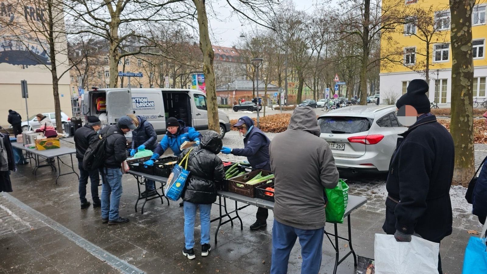 Ein ganz besonderes Highlight entstand spontan an der dritten Station. Als unser Frank für eine kleine Comedy-Einlage zum „Münchner Marktschreier“ mutierte, war das Eis sofort gebrochen. Einige kannten diese Rolle bereits und fingen direkt an zu lachen. So gab es nicht nur reichlich Lebensmittel für die Straße und für zu Hause, sondern auch beste Unterhaltung. Es wurde geschmunzelt, gerufen, gescherzt und die Stimmung stieg trotz winterlicher Temperaturen spürbar an. Humor verbindet und macht vieles leichter.