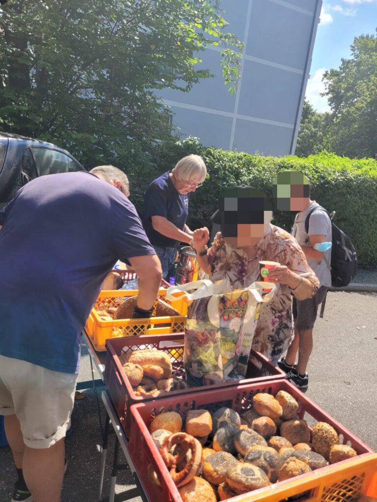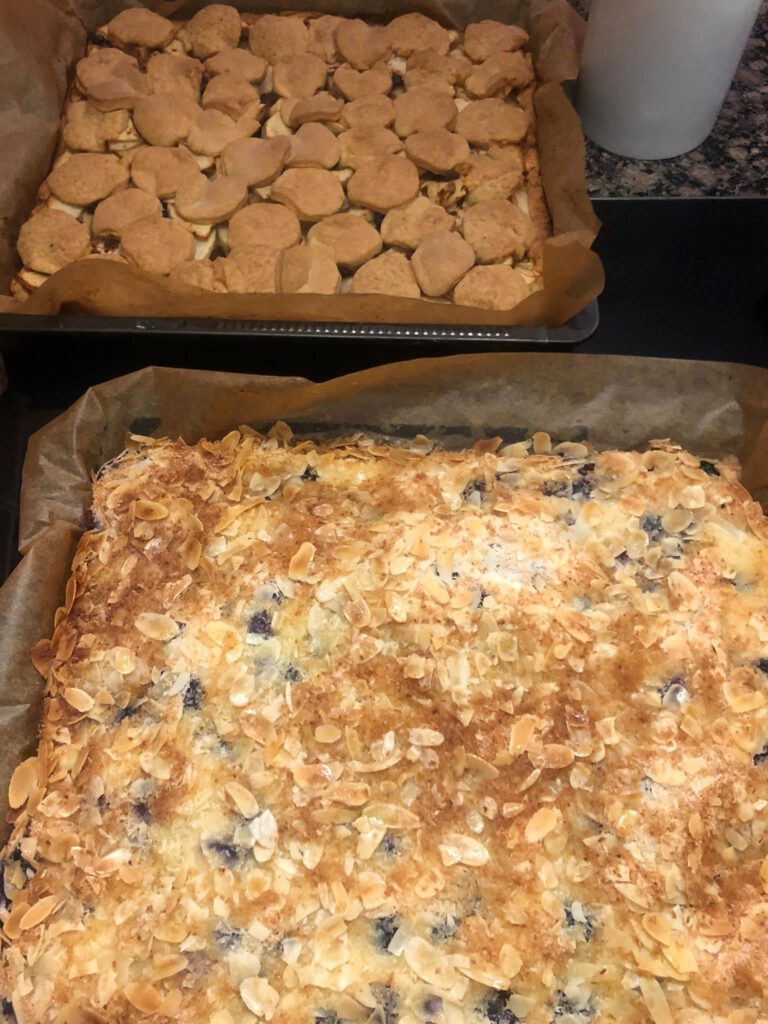 Als Nachspeise hatten wir ebenfalls etliche Kuchen im Gepäck. Es gab zum Beispiel saftige Käsekuchen mit Aprikosen und mit Beeren, Pflaumenkuchen mit Mandeln, Blaubeermuffins, Apfelkuchen mit Streuseln, Heidelbeerkuchen, Marmorkuchen, Heidelbeer-Nuss-Schnitten, Aprikosenkuchen, Zitronen-, Schokalen- und Sandkuchen. Dazu gab es frisch gebrühten Kaffee oder Eistee.