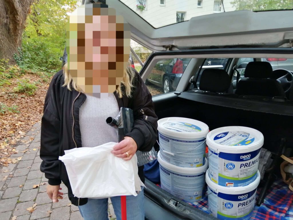 Unser Teammitglied Renate nahm sich der Sache an und besorgte mehrere Kübel Farbe, Abdeckfolien und Zubehör. Die Übergabe fand Anfang dieser Woche statt und Renate machte zwei Menschen damit sehr glücklich.