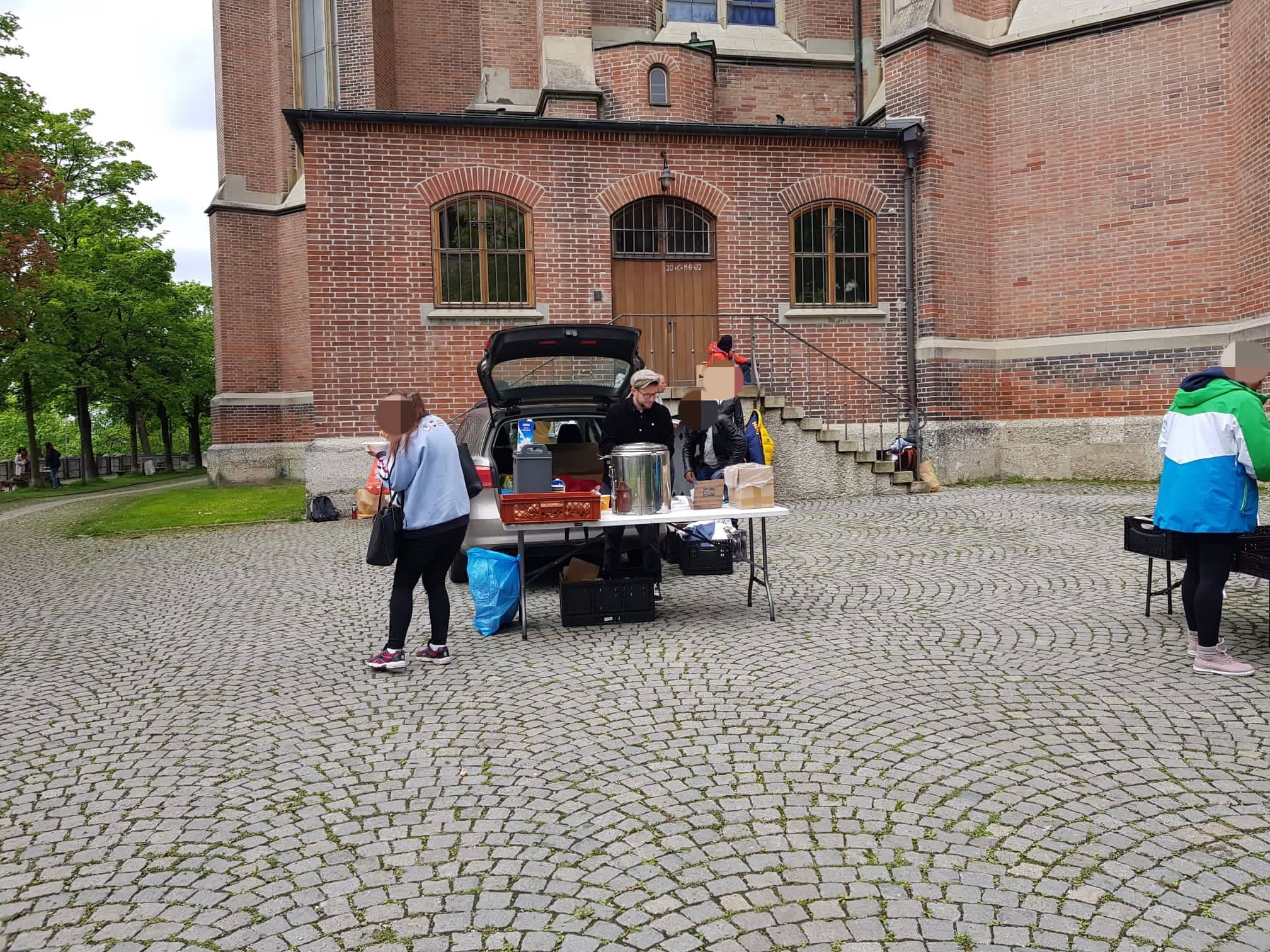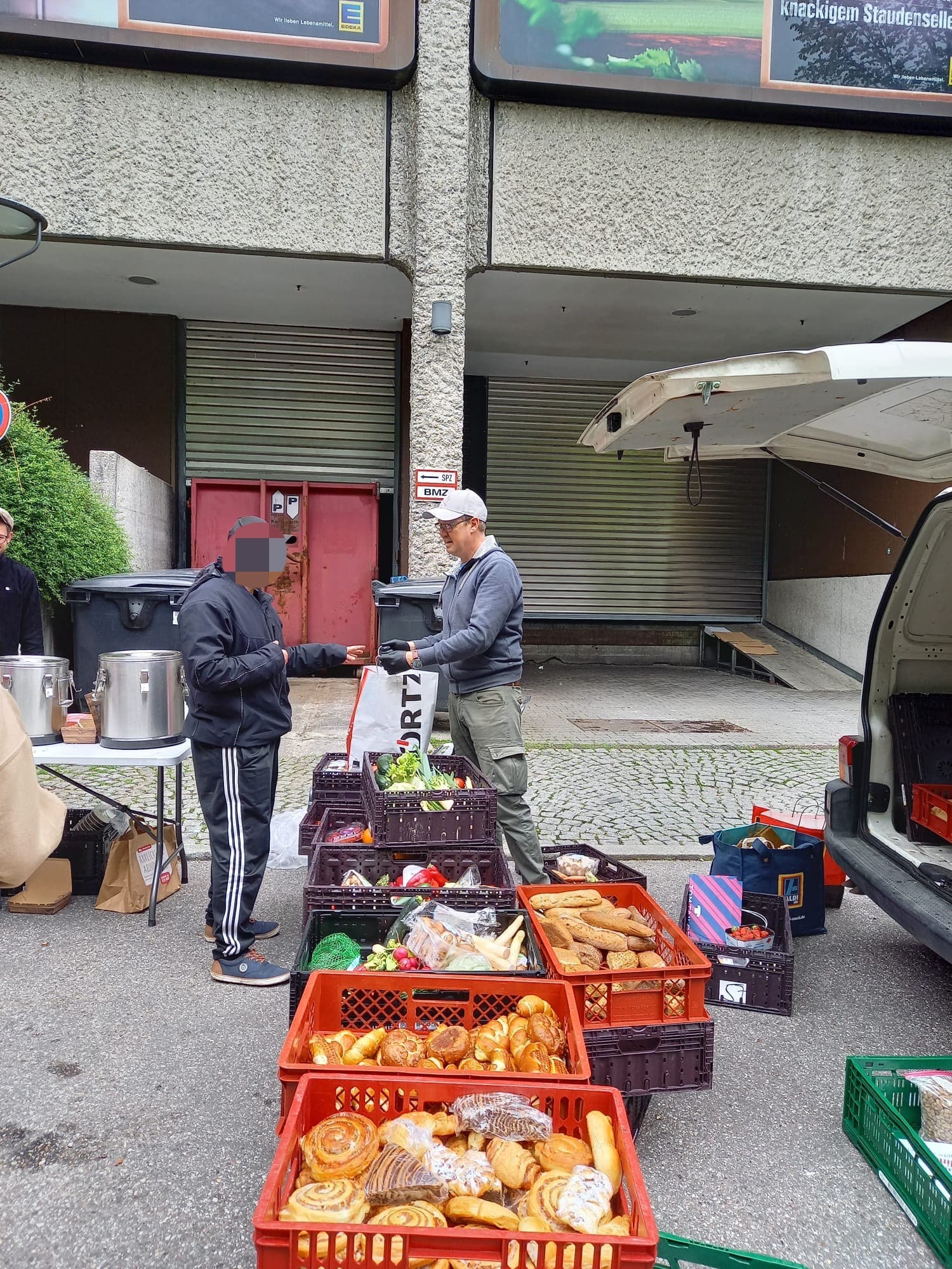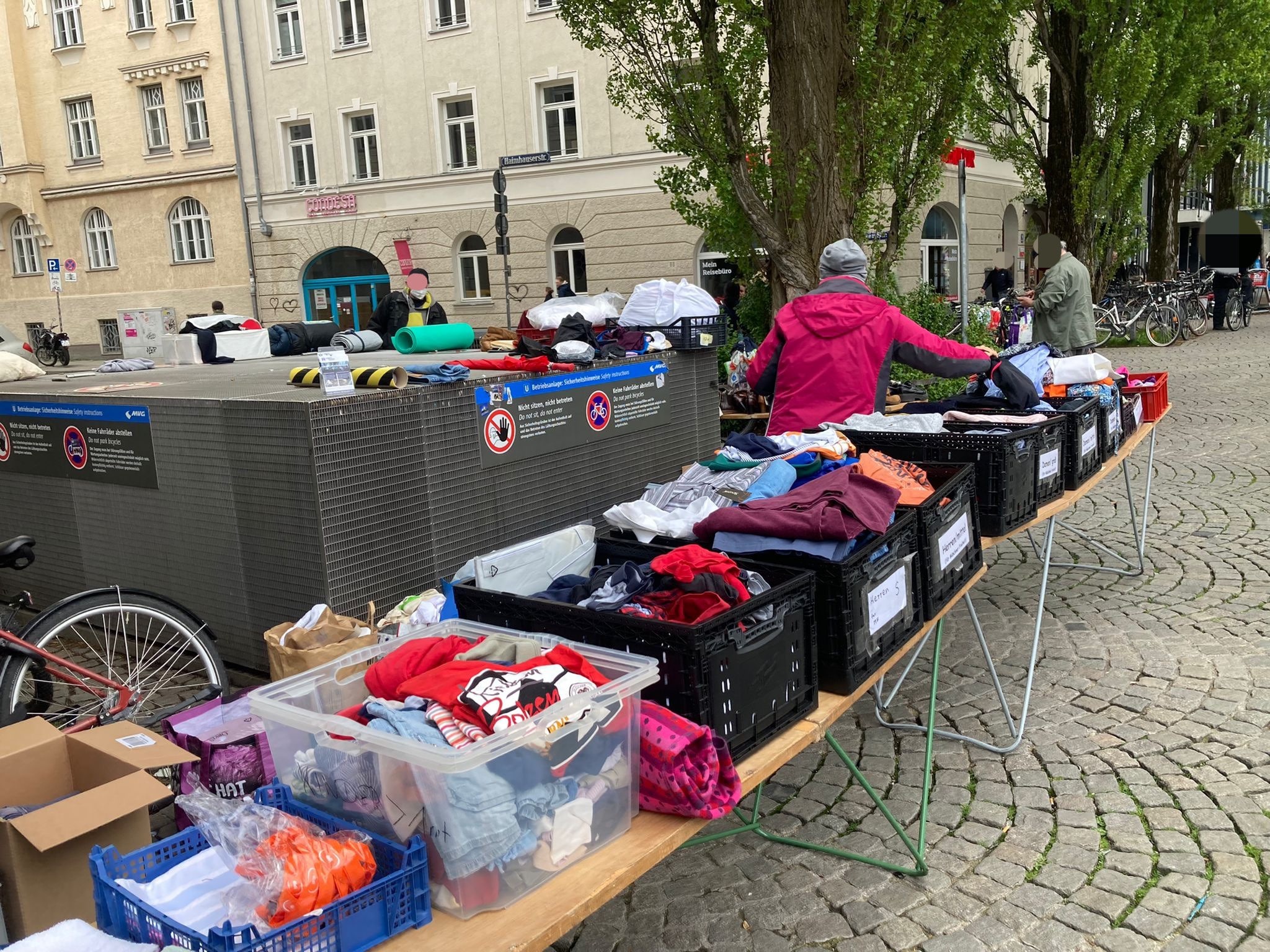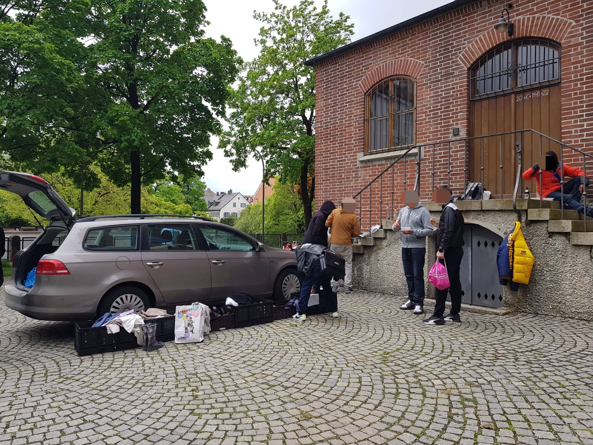 Peter, der uns seit ein paar Monaten begleitet, hilf ebenfalls jeden Sonntag bei der Lebensmittelausgabe an der Leopoldstraße mit. Selbstverständlich darf er sich selbst auch eine große Tüte packen. Dieses Mal brachte uns Peter sogar eine große Menge toller Kleiderspenden mit, die wir direkt weiter verteilen konnten.