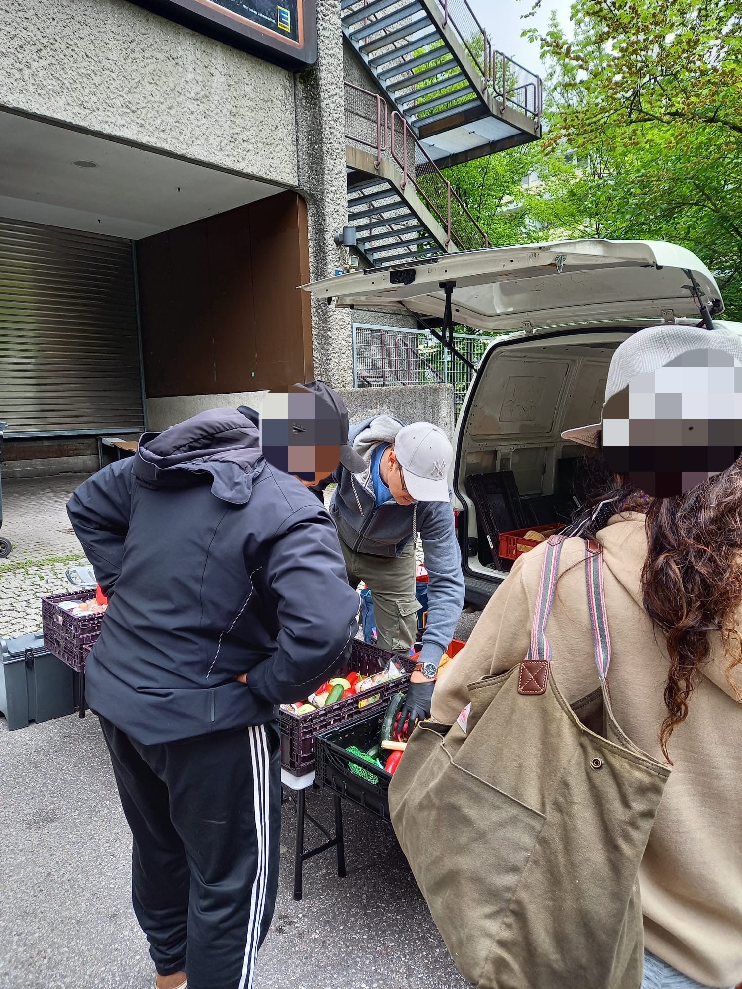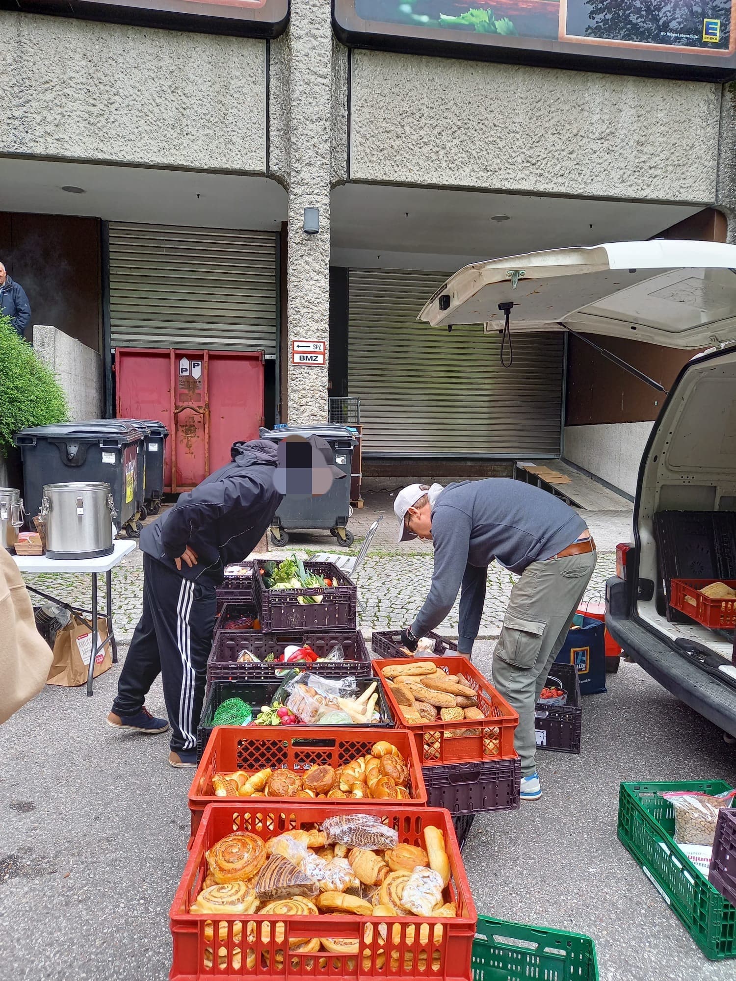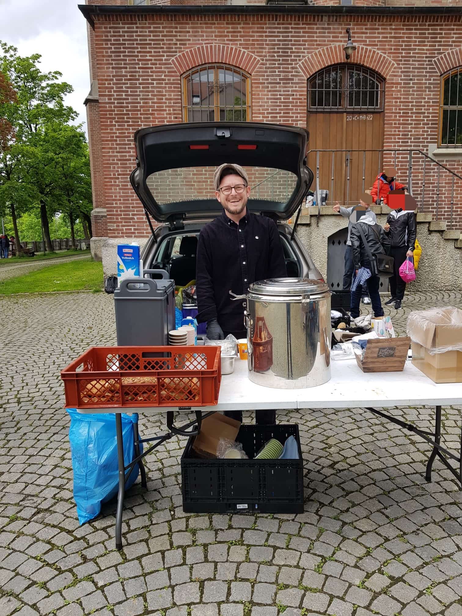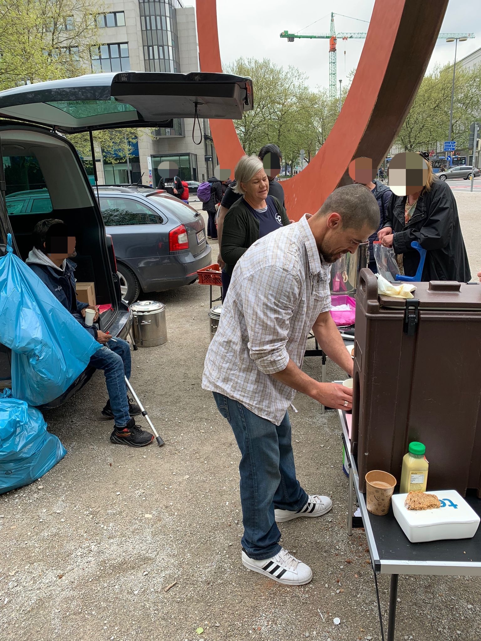 Peter, der uns seit ein paar Monaten begleitet, hilf ebenfalls jeden Sonntag bei der Lebensmittelausgabe an der Leopoldstraße mit. Selbstverständlich darf er sich selbst auch eine große Tüte packen. Dieses Mal brachte uns Peter sogar eine große Menge toller Kleiderspenden mit, die wir direkt weiter verteilen konnten.