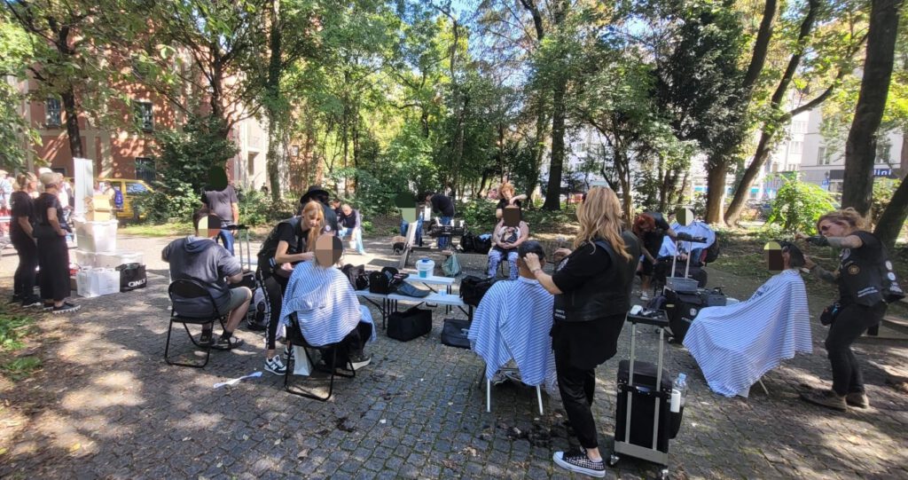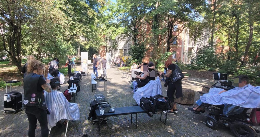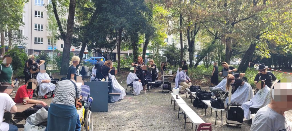 Währen vorne am Eingang unsere Essens- und Lebensmittelausgabe in vollem Gange war, zauberten 15 ehrenamtliche Friseure insgesamt 83 obdachlosen und bedürftigen Menschen ein Lächeln mit einer neuen Frisur ins Gesicht.