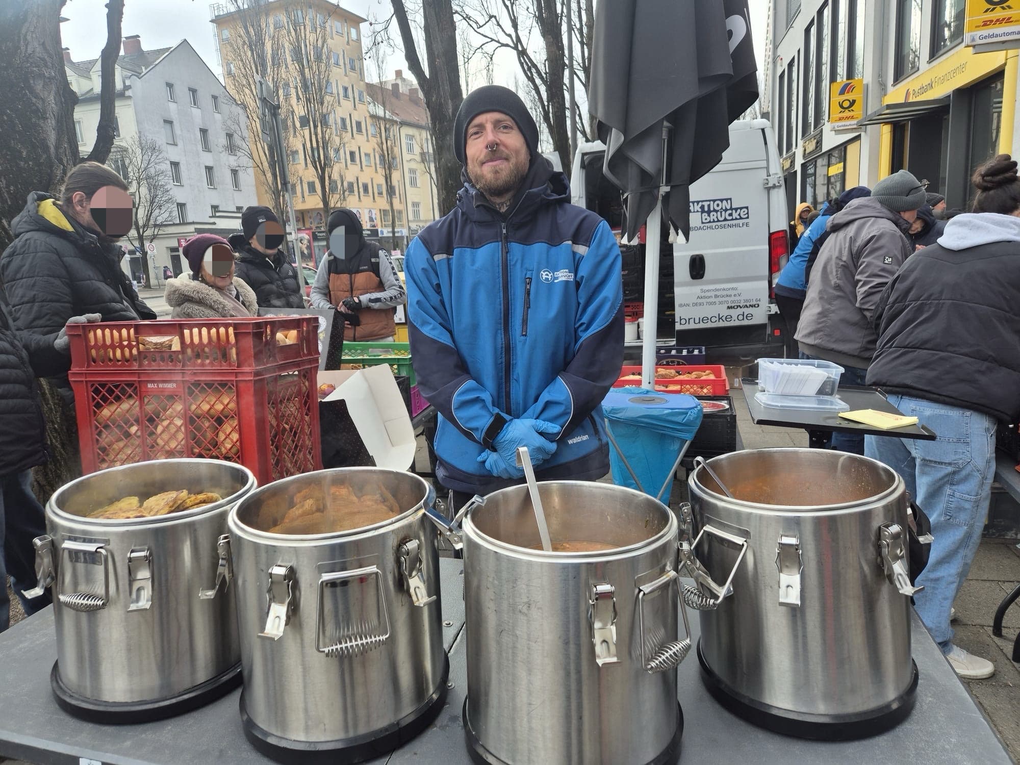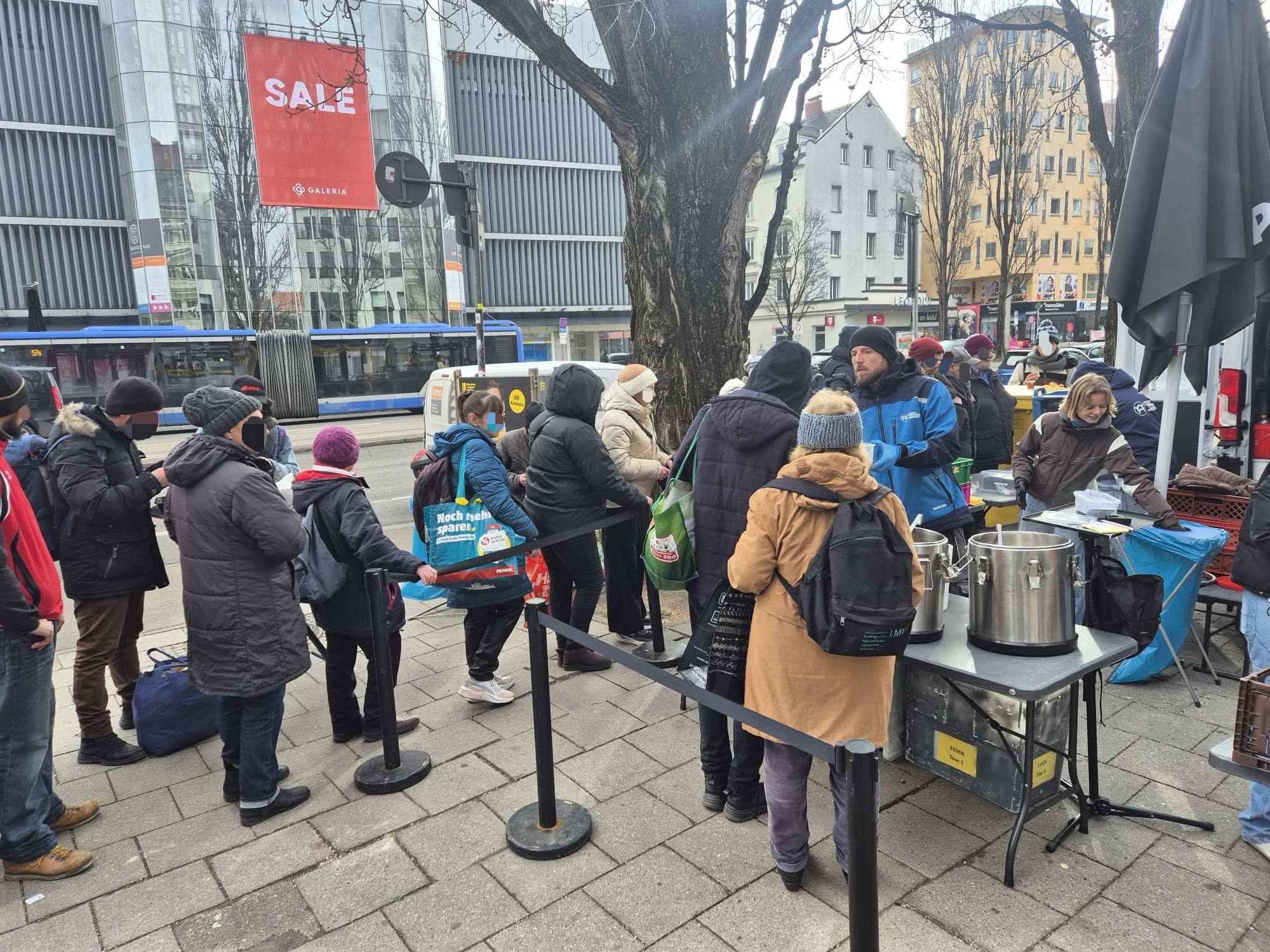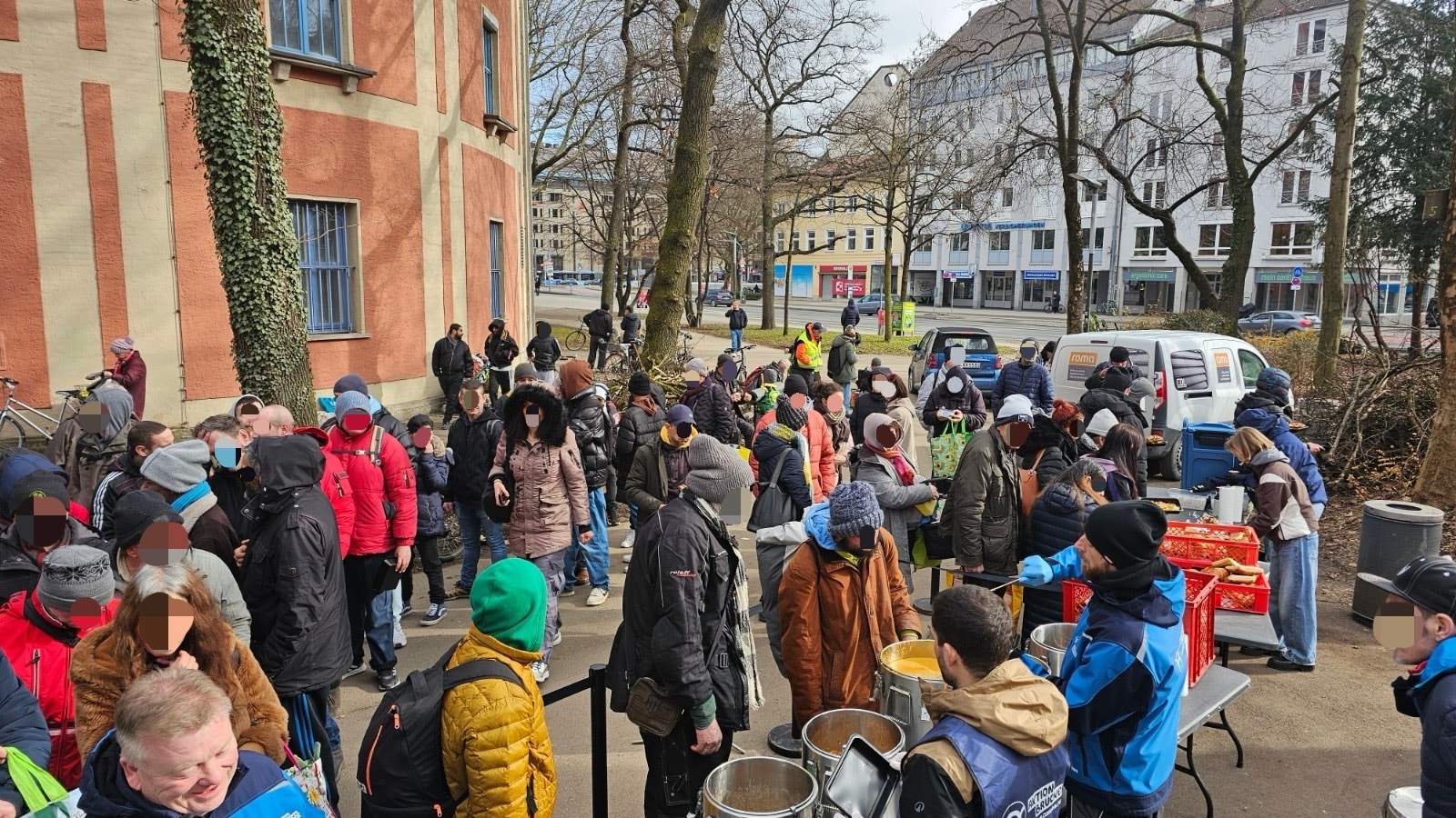 Tour 1 begann an der Münchner Freiheit zunächst ganz entspannt. Am Nussbaumpark war es dann deutlich voller mit vielen Gästen. Dennoch blieb alles ruhig und ohne besondere Vorkommnisse. Die Freude über Kleidung, Lebensmittel, warmes Essen sowie Kaffee und Kuchen war groß. Viele Gäste bedankten sich herzlich für unsere gemeinsame Arbeit und die verlässliche Unterstützung.