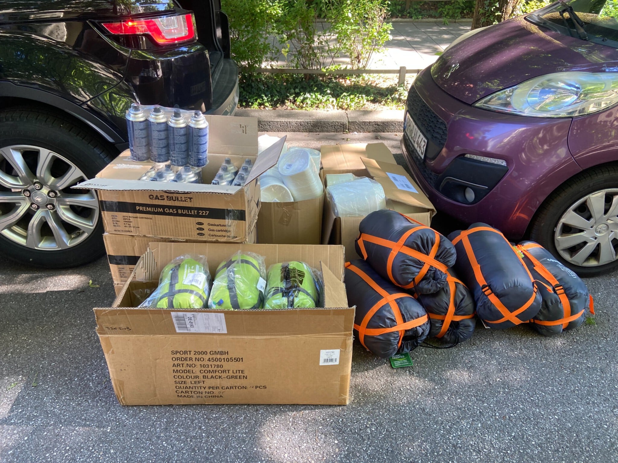 Abschließend wurden Anja von Hendrik und Sonja Sachspenden im Wert von 1000€ überreicht, die von den Angels extra eingekauft wurden. Dabei handelte es sich um transportable Tische für unsere Essenausgabe, 1500 Suppenschüsseln, 1500 Löffel, 17 Schlafsäcke und 96 Gaskartuschen.