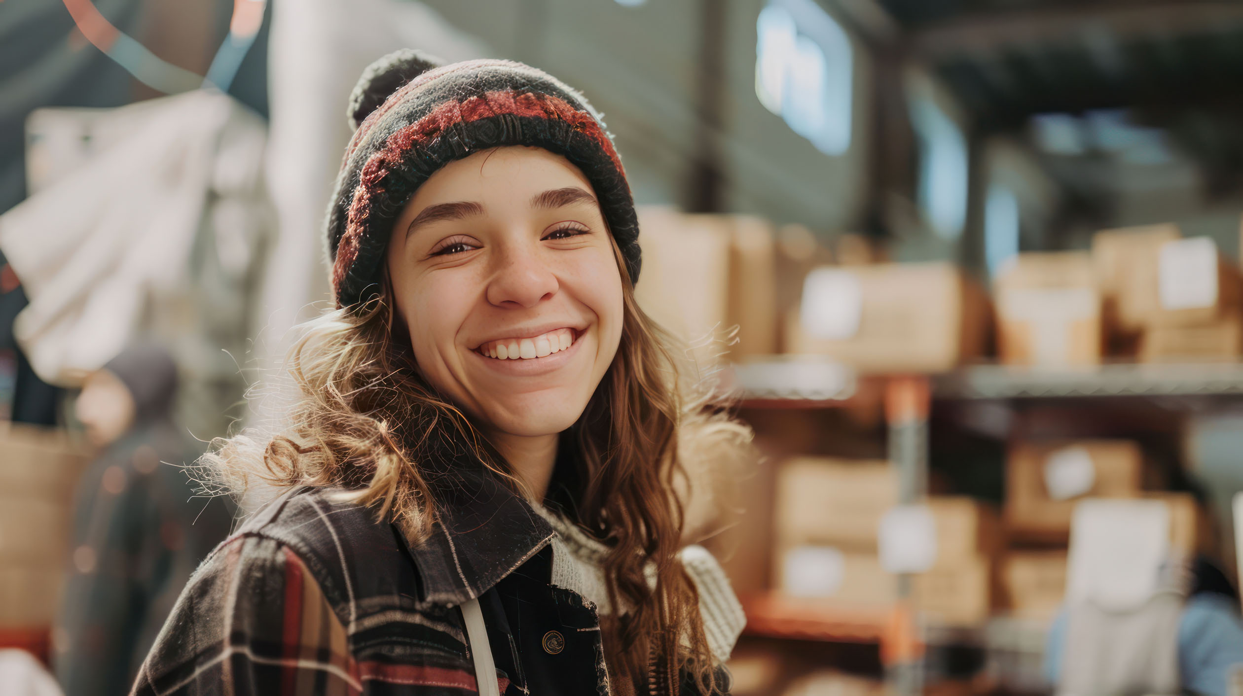 junge helfende Frau steht in einem Lager und lacht in die Kamera