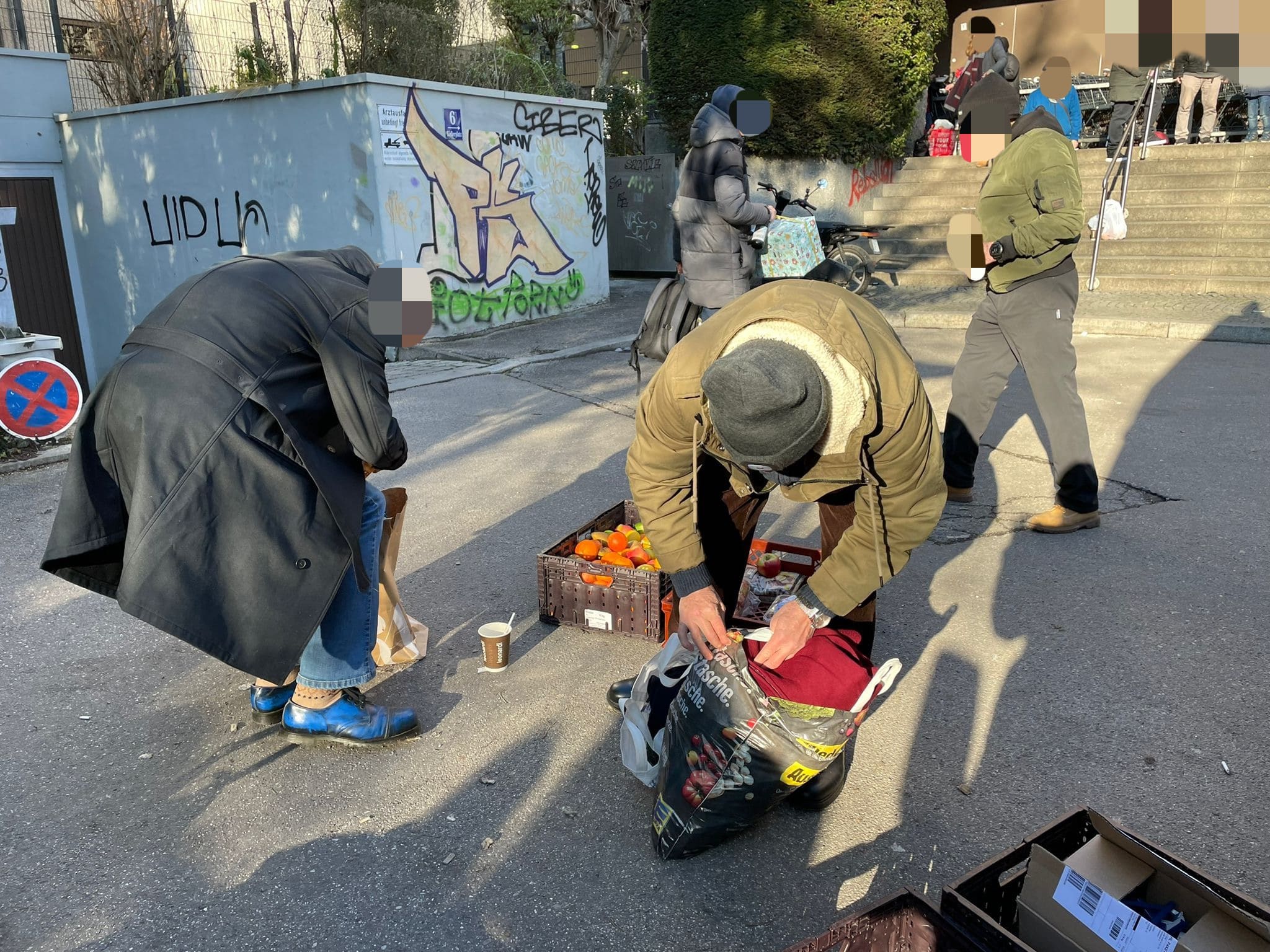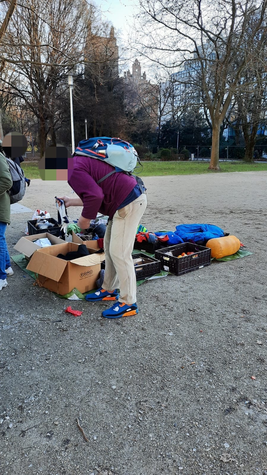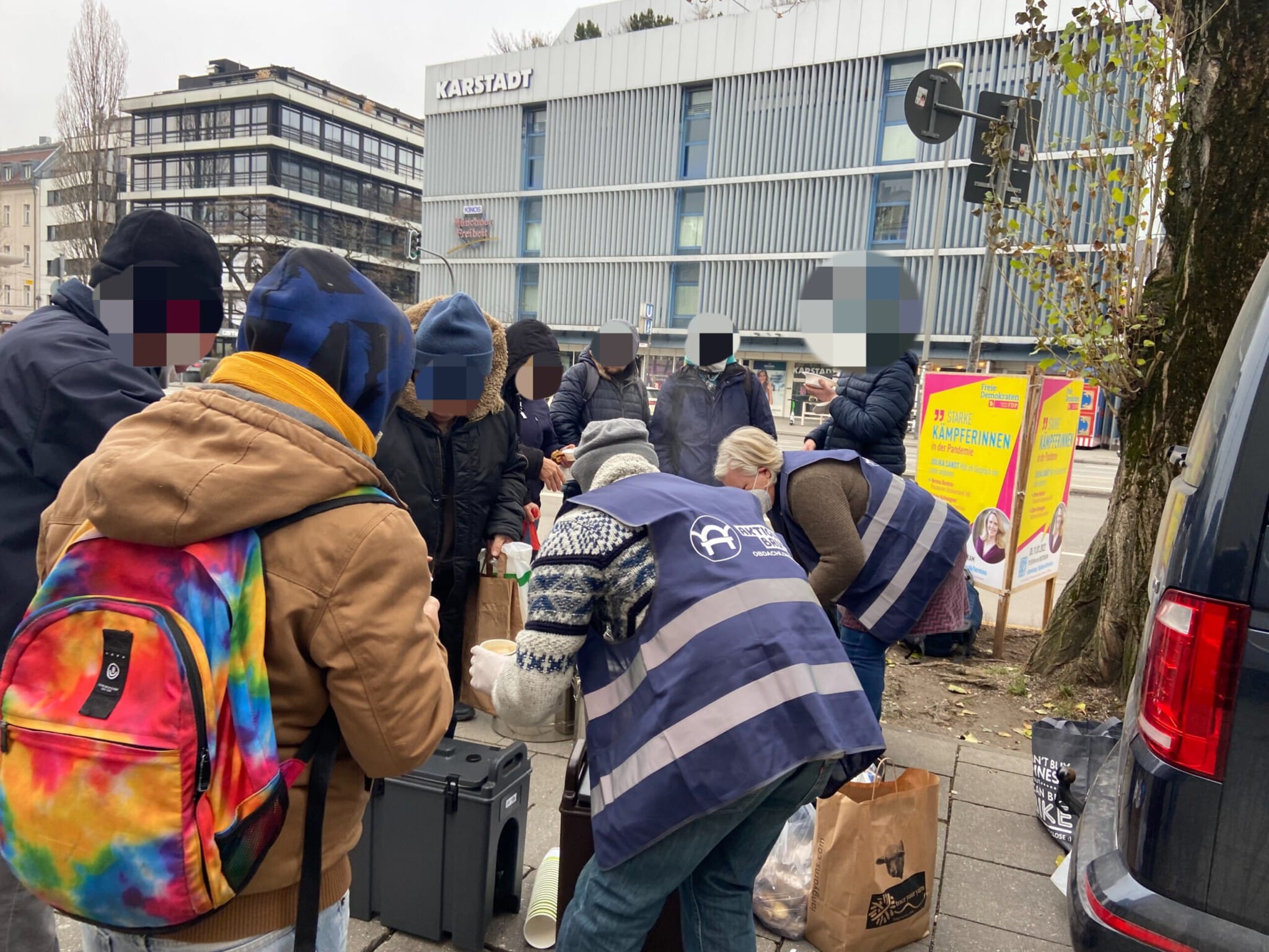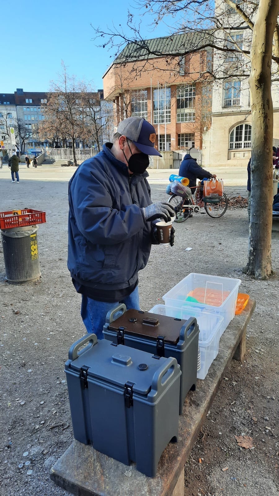 Bei unserer zweiten Station wurden wir, als wir bereits abfahrbereit waren, von einem Passanten darauf aufmerksam gemacht, dass hinter unserem Fahrzeug ein hungriger Mann, die Essensreste aus dem Mülleimer aß. Also packten wir nochmal Töpfe, Kuchen und Kaffee aus, was er hungrig und dankend annahm. Des Weiteren konnten wir ihn mit Handschuhen, einem Schlafsack und einer Isomatte ausstatten.