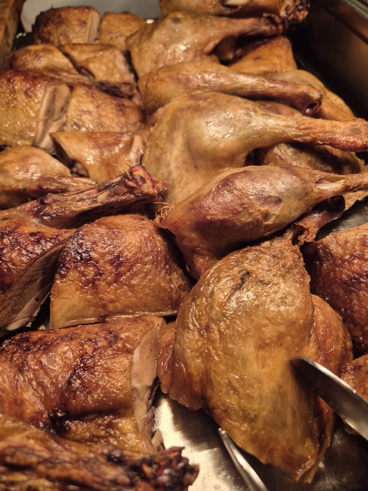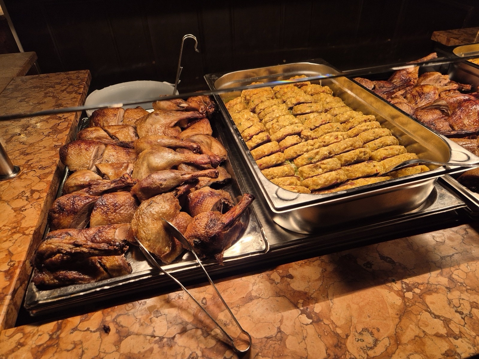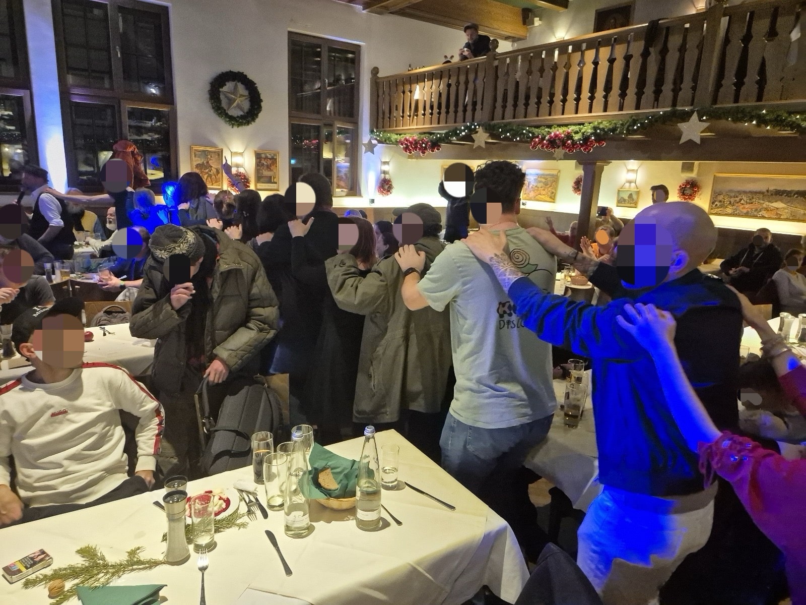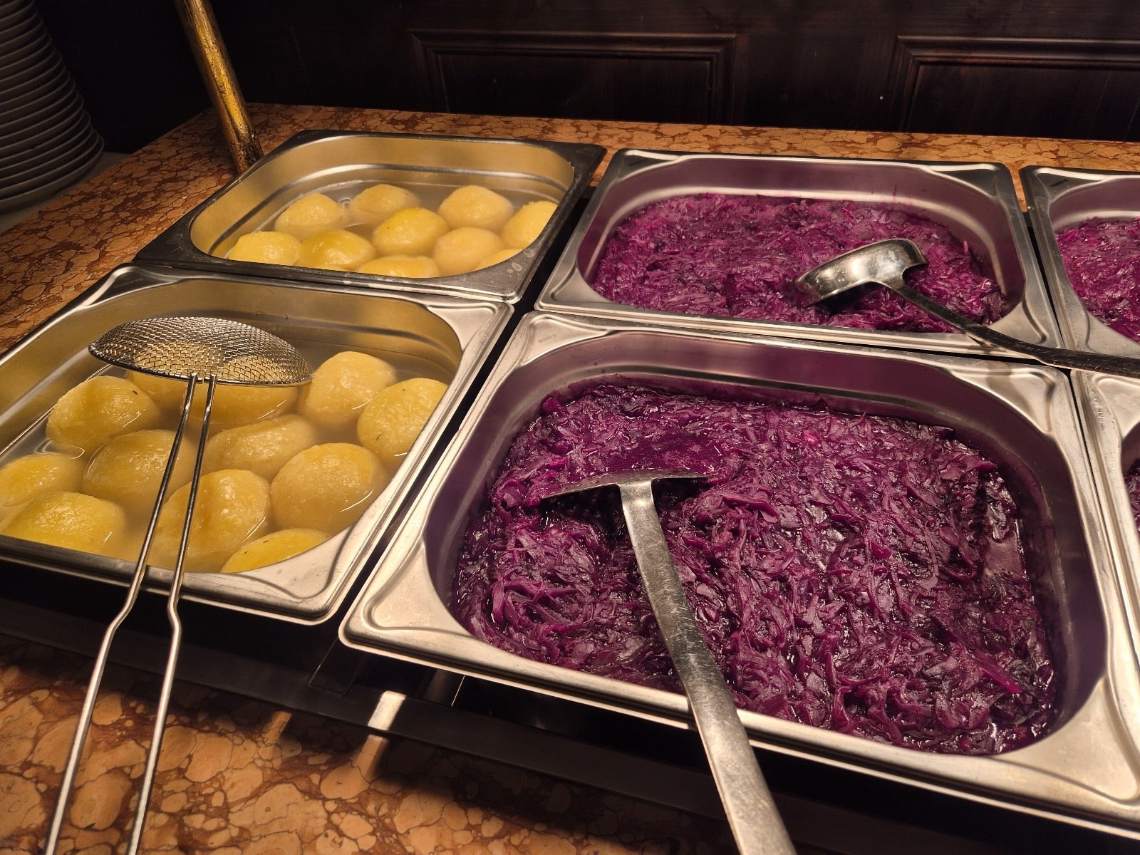 Als das Buffet eröffnet war, durften wir gemeinsam ein weihnachtliches Festmahl genießen. Zur Vorspeise gab es verschiedene Aufstriche mit Bauernbrot und reschen Brezen. Als Hauptspeise wurde knusprige Ente mit Knödel, Blaukraut und Sauce serviert, alternativ vegetarische Kaspressknödel mit Rahmwirsing. Zum Abschluss eine feine Bayerisch Creme mit Früchten und Himbeermus. Ein besonderes Essen, das Wärme geschenkt und Gemeinschaft geschaffen hat.
