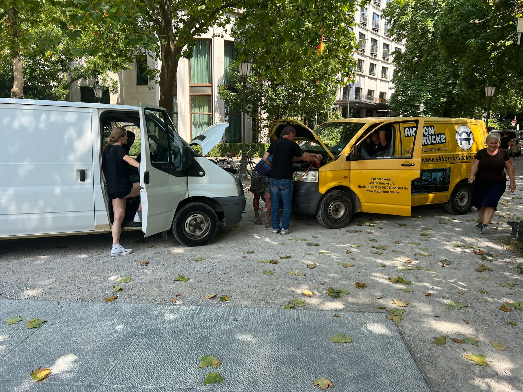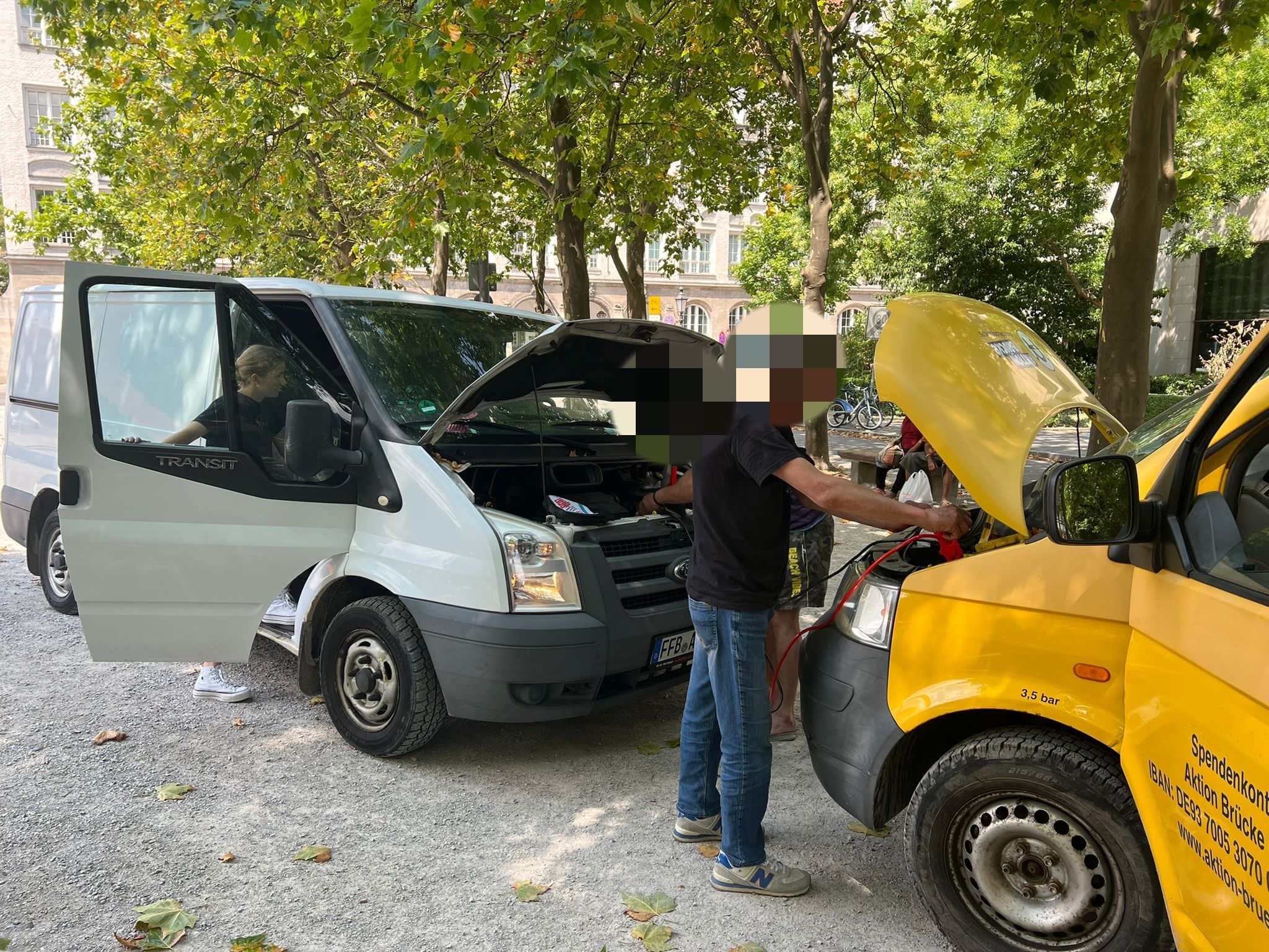 Als das Team endlich abfahren wollte, sprang der Transit nicht mehr an und wir mussten erstmal das Auto fremdstarten. Während wir mit den Fahrzeugen beschäftigt waren, klappte ein Mann bei der Hitze zusammen. Sein Kreislauf machte nicht mehr mit und das Team informierte den Notarzt. Man könnte sagen, die leere Batterie kam wie gerufen. Sonst wären wir nicht mehr da gewesen um Hilfe zu leisten.